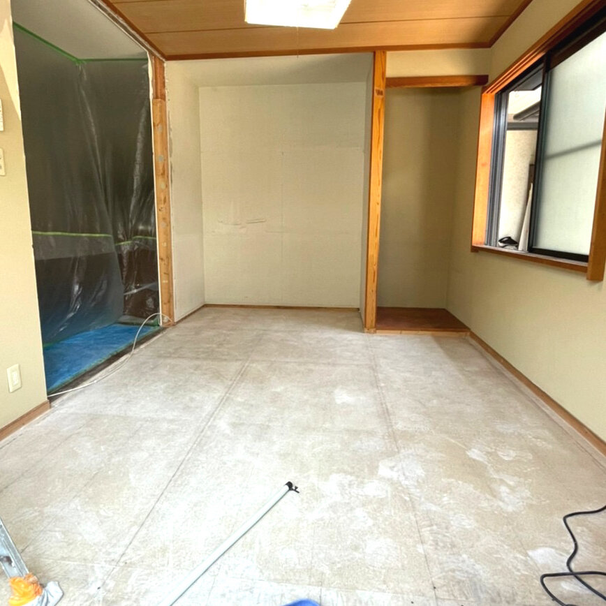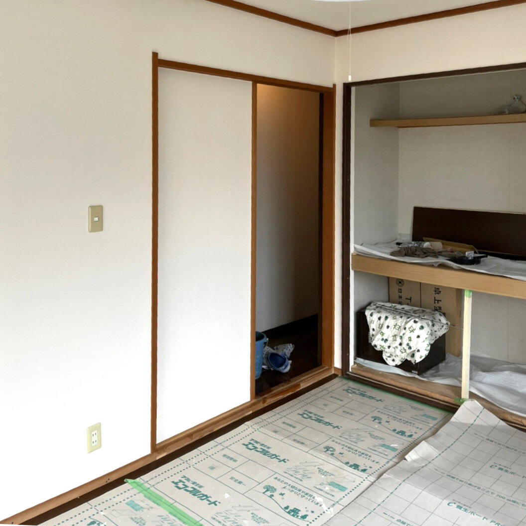Before工事中、畳を取り払い、押し入れも空間に。After棚とハンガーパイプを設置します。使い勝手の良い収納を設置しました。居室BeforeAfter元が畳の和室だったとは思えない程、見事に洋室へリフォームです。