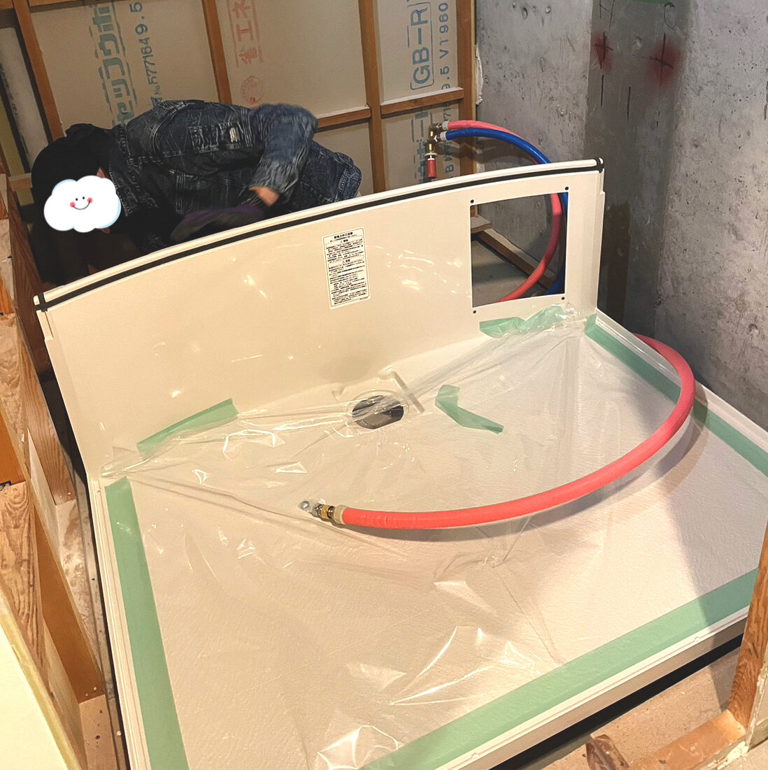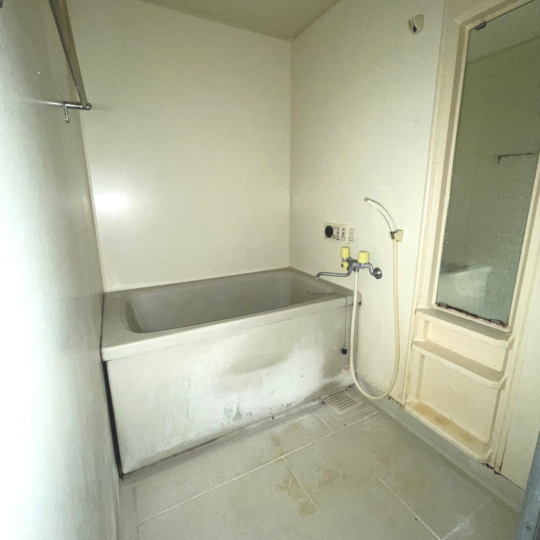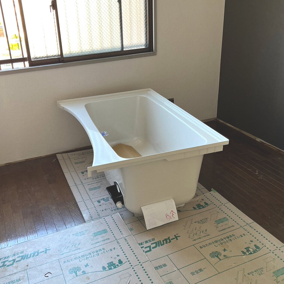 Before浴槽を取り除きました。周りの壁を撤去し、配管だけが残り、これから工事が始まります。ユニットバス、床になる部分。浴槽。完成!くたびれていた浴室が、こざっぱりした輝く浴室に変身、