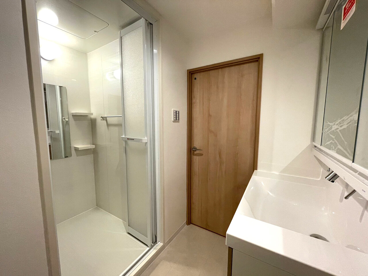 扉と洗面化粧台のナチュラルカラーがクロスのホワイトと上手く調和して、