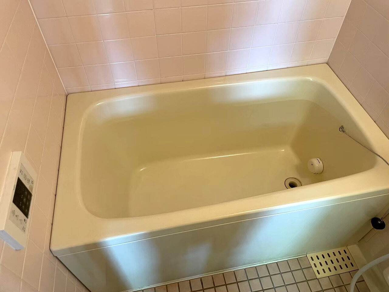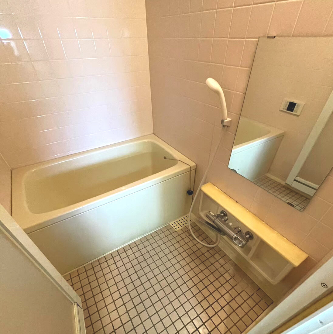 暖色ですがタイル張りのこれからの季節厳しくなってくる浴室です。やはり掃除は難しそうです
