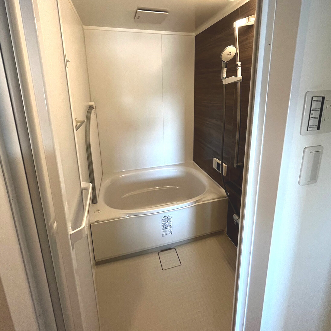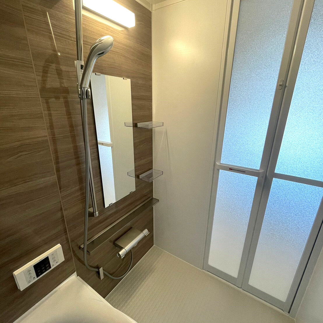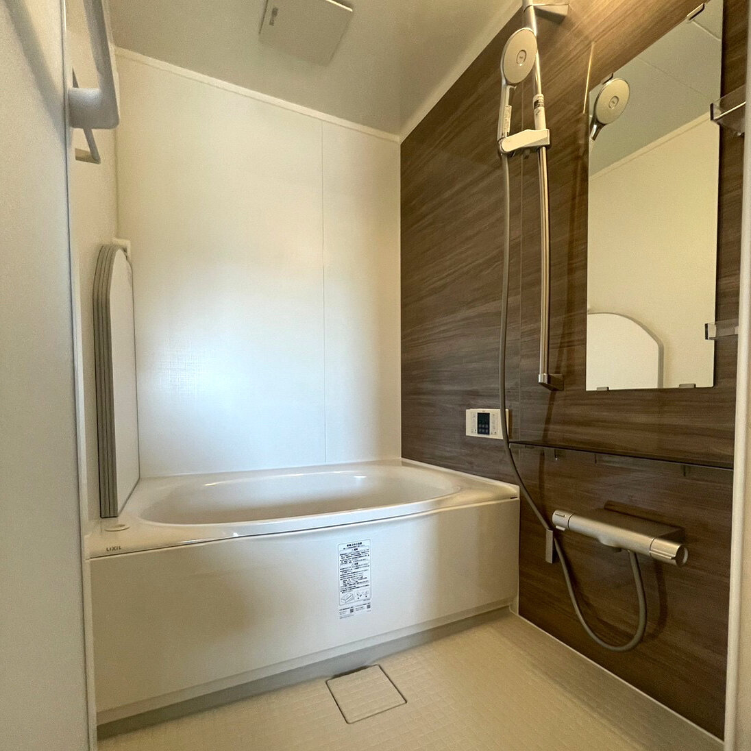 パネルは木目調で温かさを演出、水栓も洗練されたデザインでオシャレです。併せて給湯器も新しくなっています。浴槽が丸くかわいいです。