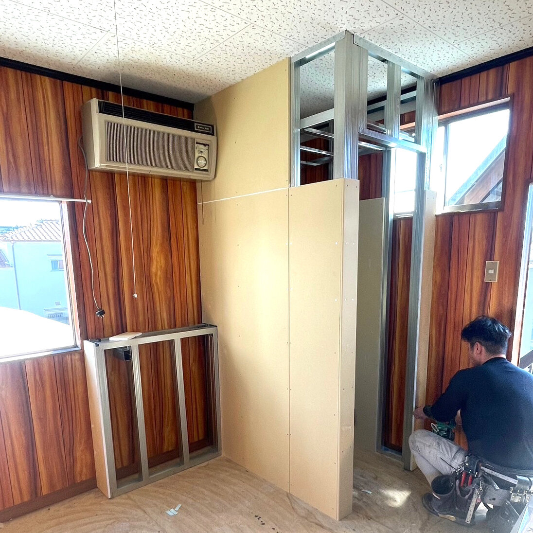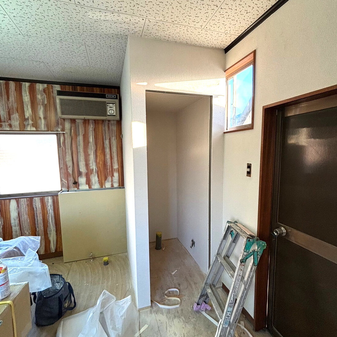 Beforeここにトイレを作りますトイレの壁作ってますクロスを貼って、トイレ完成です何も無かった部屋の片隅にトイレ誕生です
