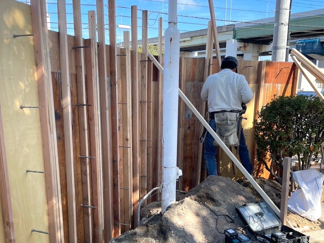 表側から木製枠で覆います次回コンクリートを流し込んで門壁を作っていきます