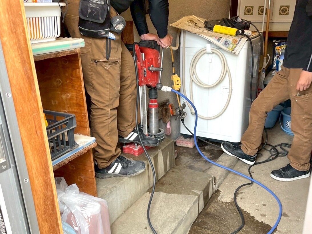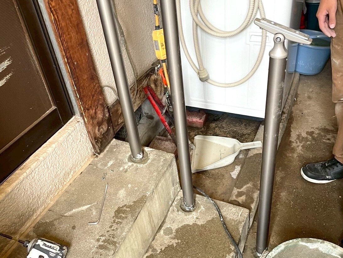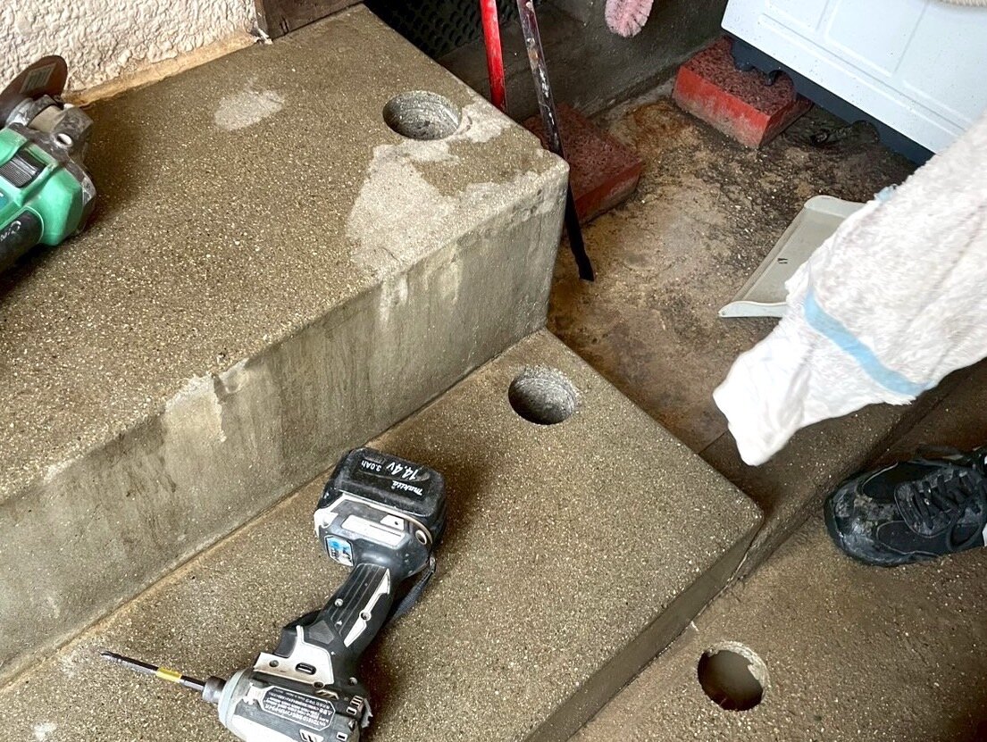 Before外に繋がる階段です職人さん、手すりのための丸い穴を作っていますコンクリートにキレイな丸い穴できました基礎の完成です