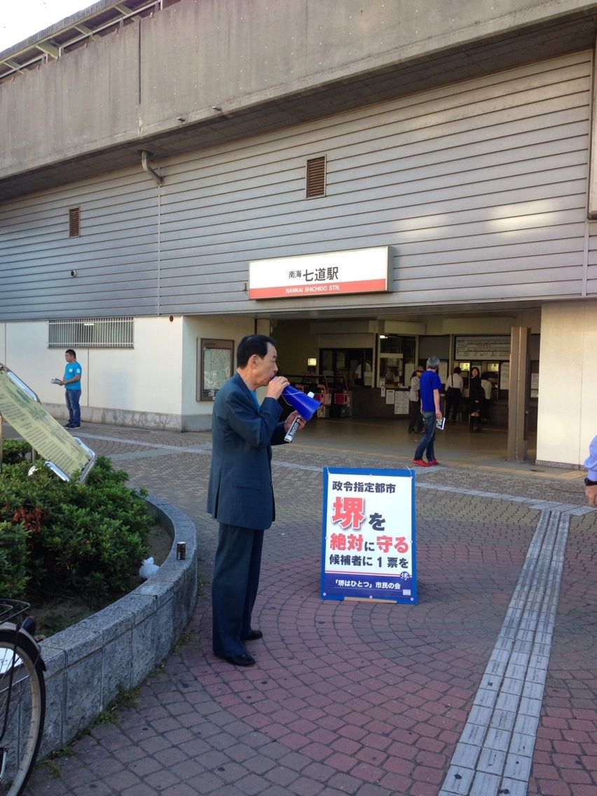 2013年09月27日 七道駅で朝立ちしてきました。 けさは7時から市長選の竹山候補のお願いに南海本線七道駅で朝立、ビラ配りに行ってきました! 我が自民党の西村市議がメガホンを握り声を枯らし出勤途中の皆さんにお願いしました。 今回は政党を越えた選挙になっており、通常ではなかなかみれない、民主党や共産党の議員さんや後援者さんなど、入り混じって運動してます! 日曜日に迫りましたが、竹山おさみ現職が再選を果たし、益々堺市の発展と次の世代も安心して生活の出来る堺市づくりを期待して、あと二日間私も出来るだけのお手伝いしたいと思います