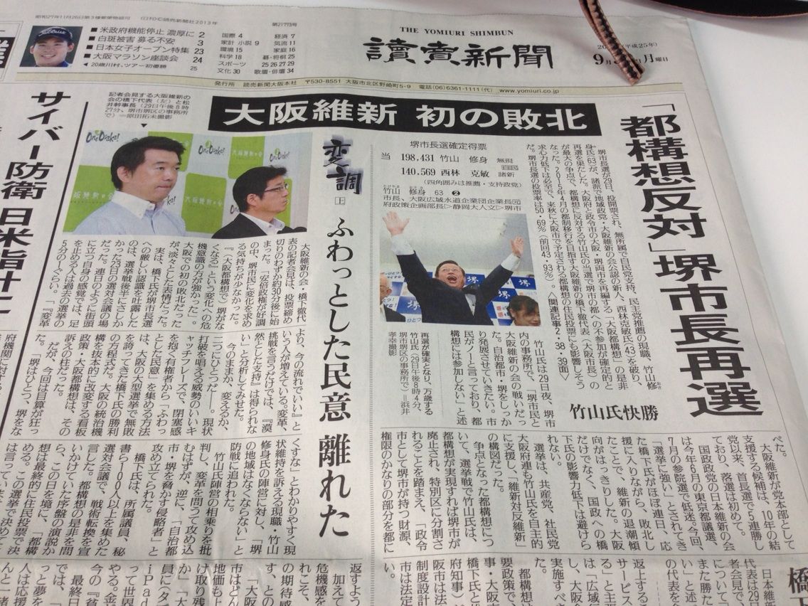 2013年09月30日 祝 竹山おさみ おはようございます。 昨日の堺市長選は、大阪都構想反対の現職竹山が再選を果たし 維新の会に打ち勝ちました! やはり堺にとって都構想が何のメリットもないと市民は判断した結果です。 橋下代表は堺市民が現状維持を選択し愚かだ!とか会見で述べたようですが、 決して違います… これから堺を改革していく上で必要とした指揮者は竹山おさみと判断したんですよ! 勢いだけで進んできたパッと出に委ねたりしません! 市民は賢い選択をしたと、次の四年間で竹山おさみ市長は必ずや思わせてくれるはずです。