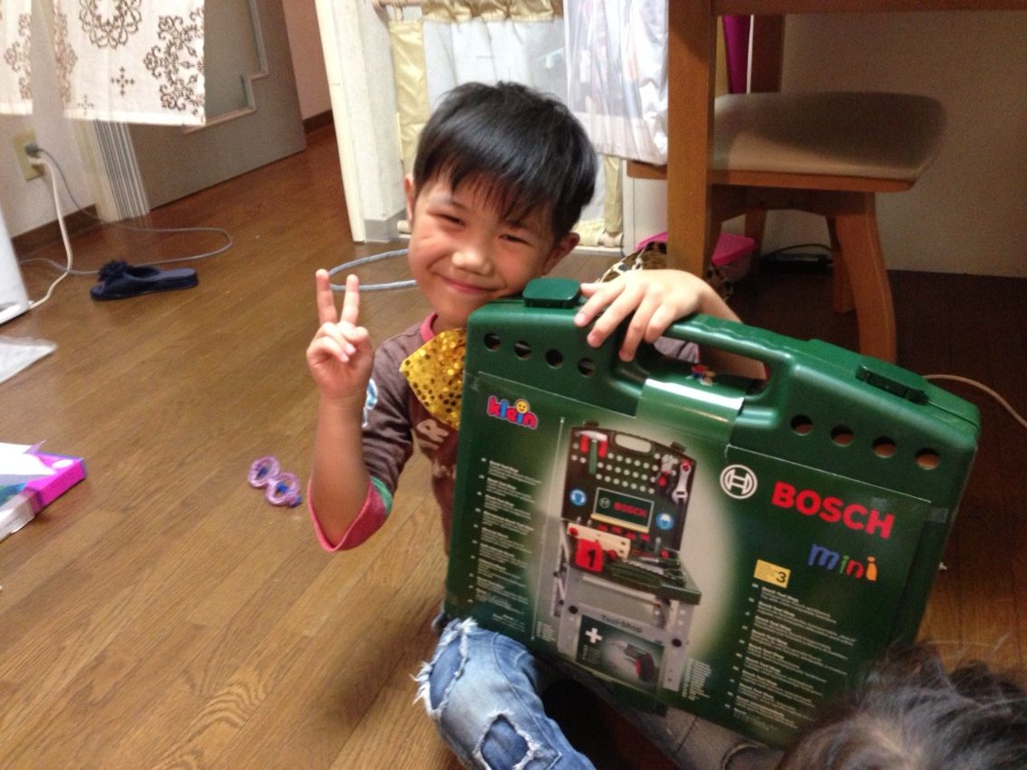 2013年09月17日 息子の誕生日 昨晩、息子の六歳の誕生日のお祝いをしました! 祭り宮入の朝に産まれて 、はや6年が過ぎ、病気や怪我も無くスクスクと育ってくれて感謝します! BOSCHの工具セットを嫁におねだりしたみたいで喜んでました