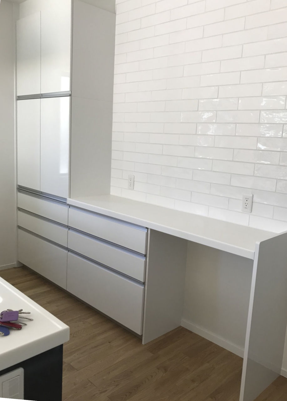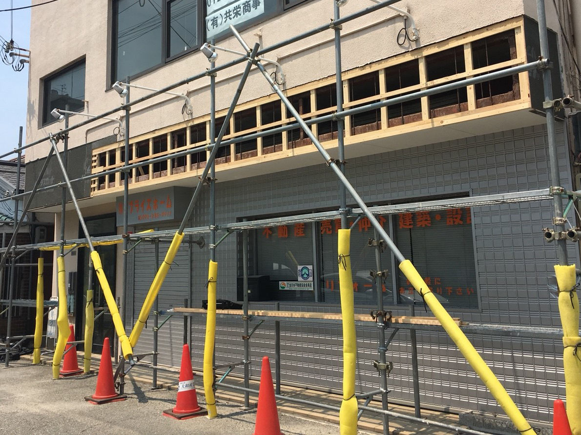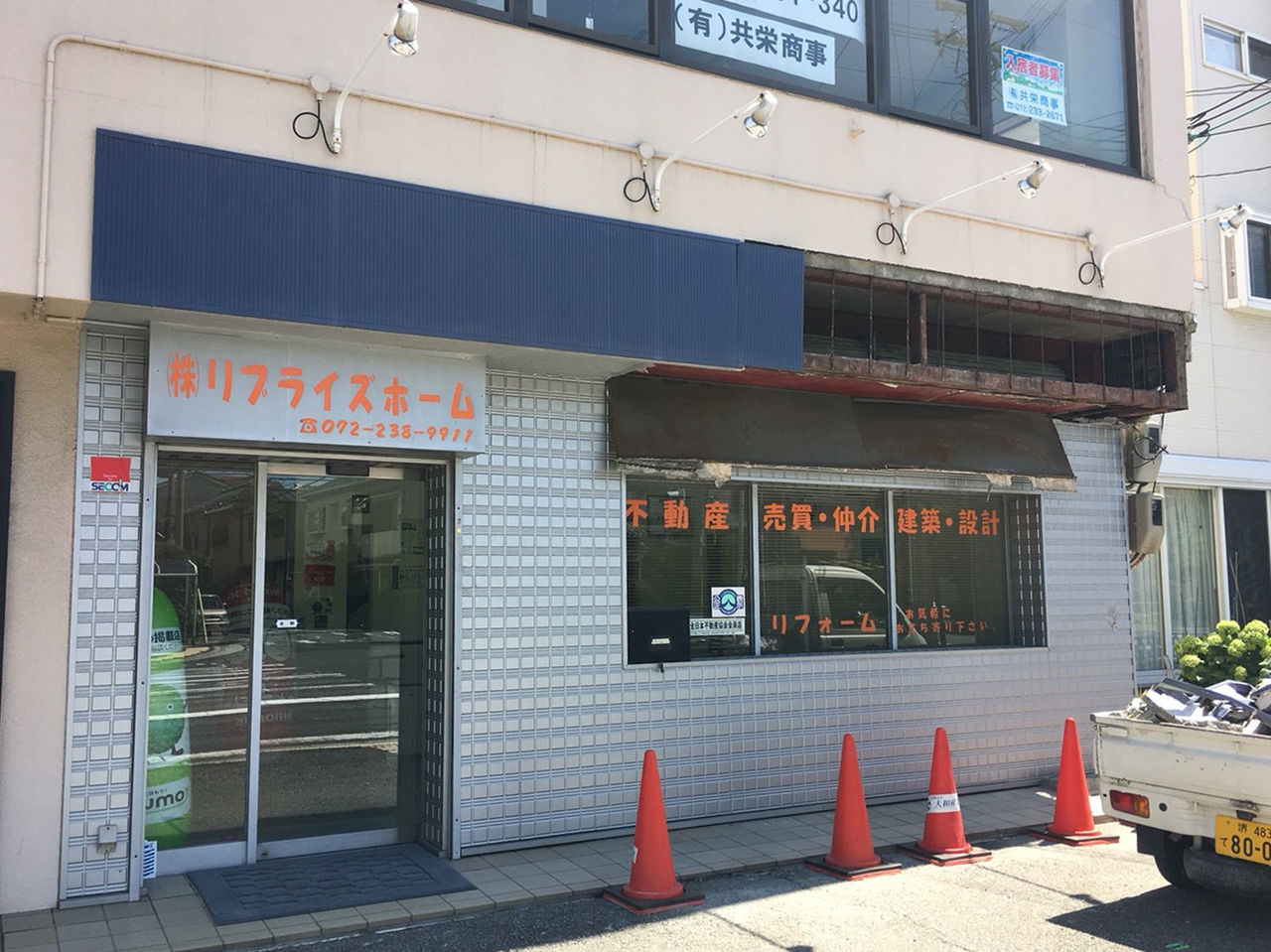 1階店舗の外壁、天井部分が損壊していましたので取り除き、外壁を塗装、社名の入った壁面看板を設置、オレンジのアクセントが効いたオシャレな店舗に仕上がりました。工期は約2週間です。