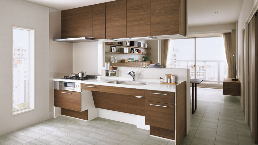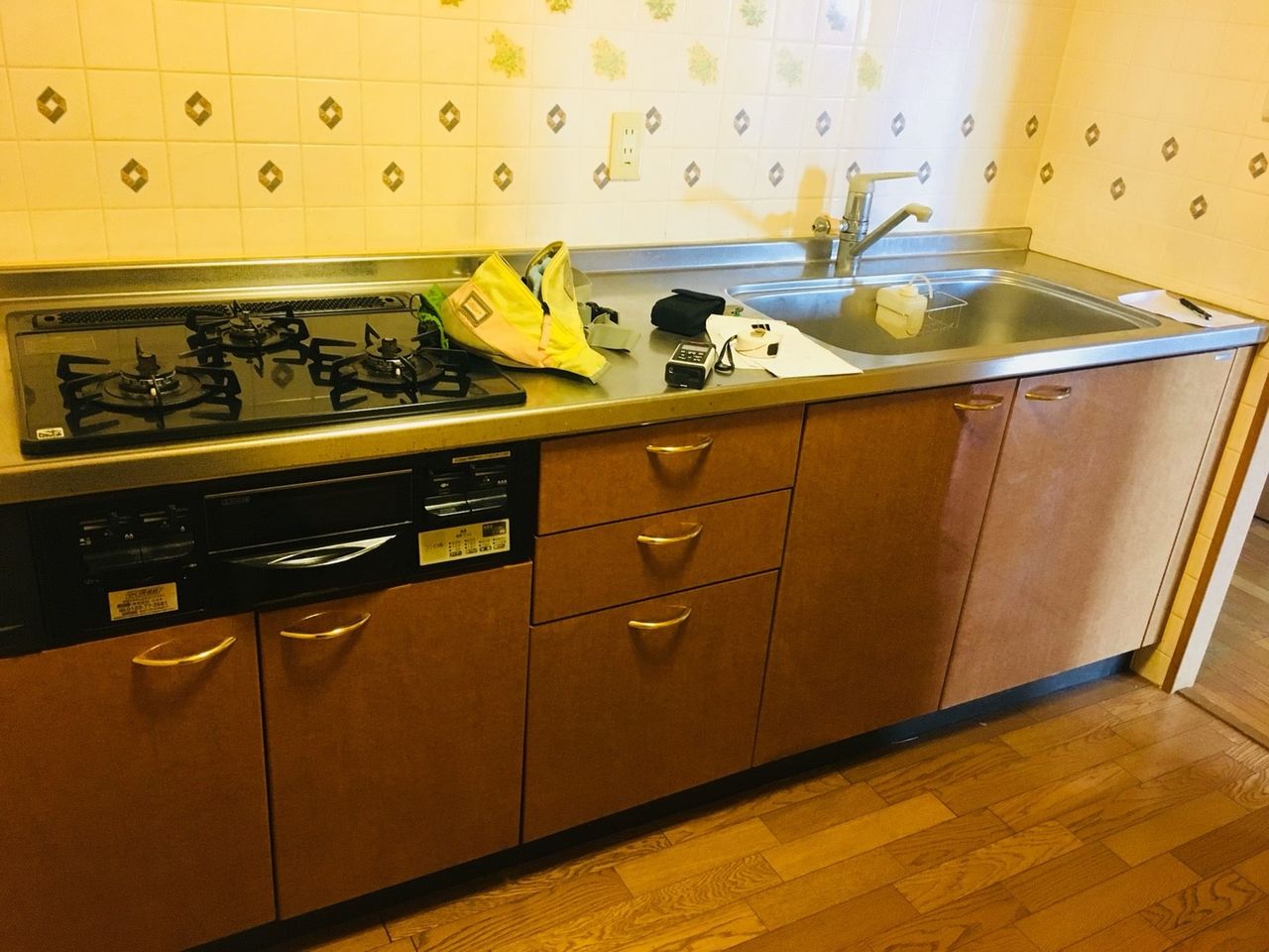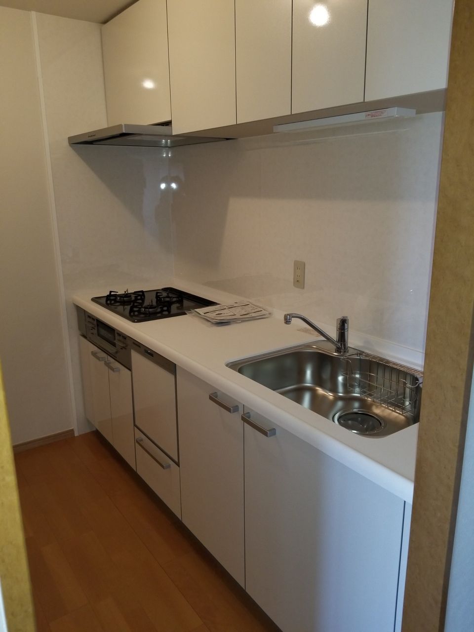 白を基調としたシステムキッチン、壁のタイルはキッチンパネルへかわり、汚れにくくお掃除ラクラクです。