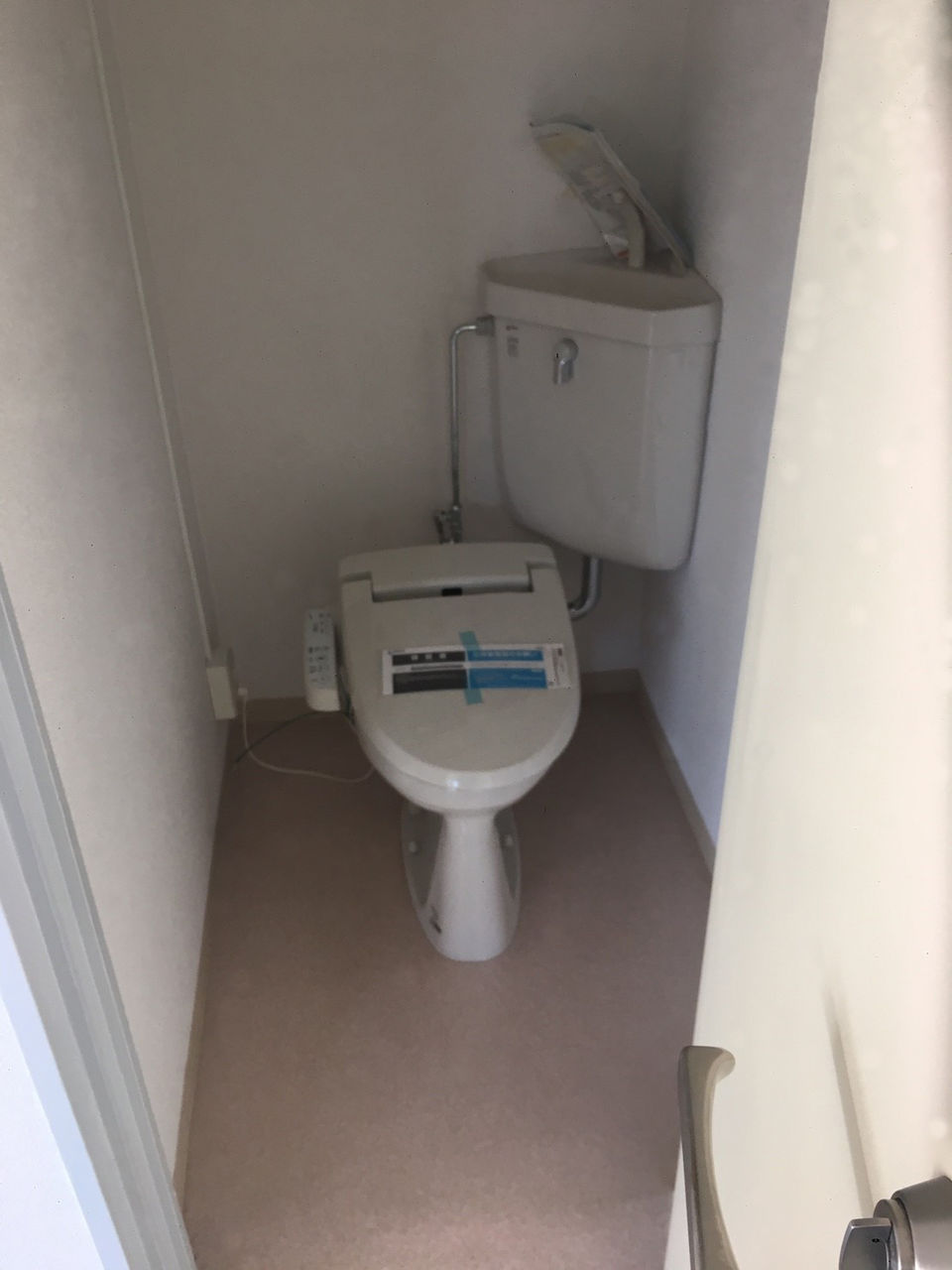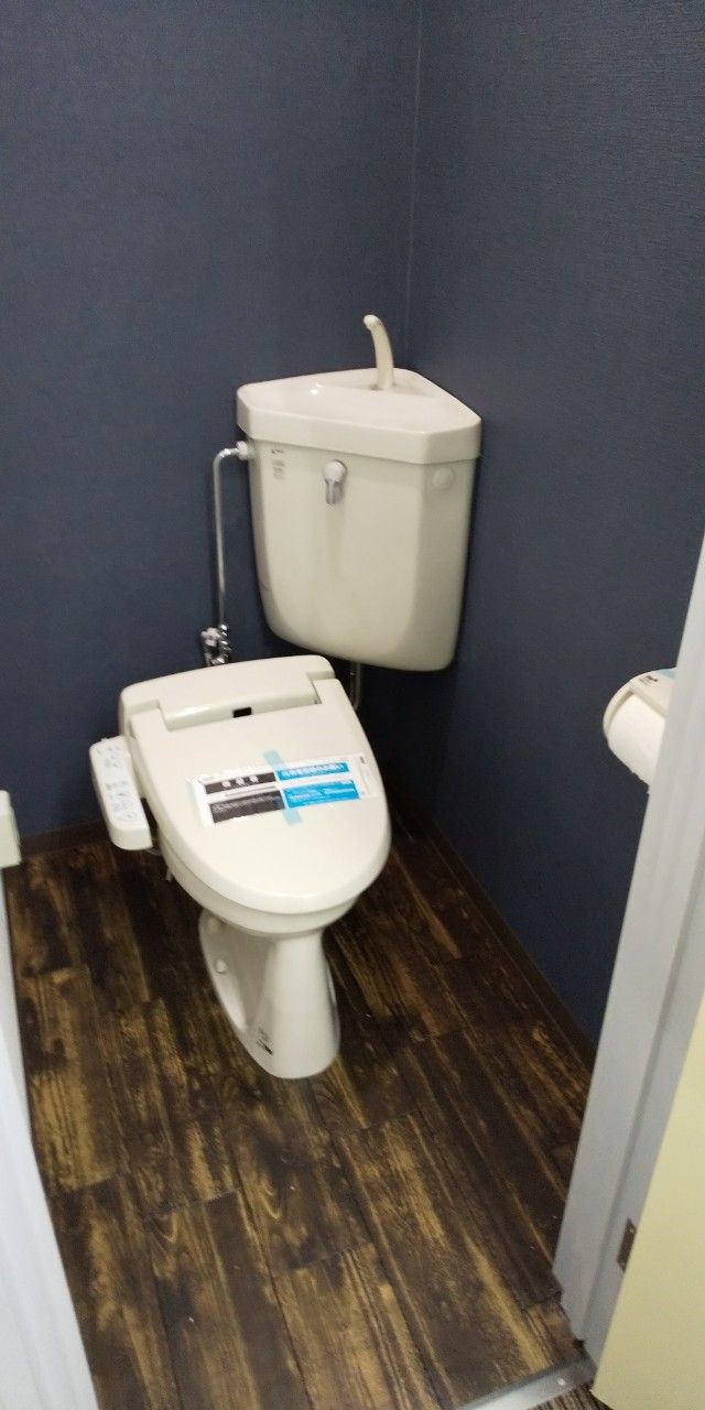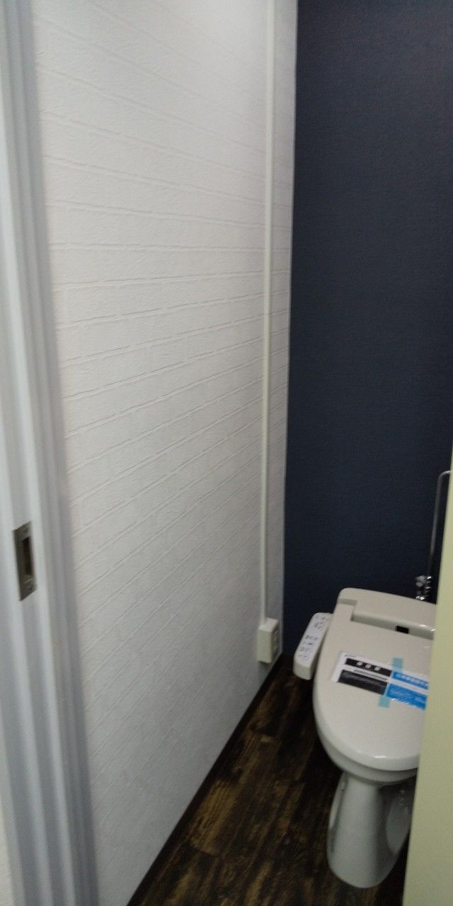 少し殺風景な事務所でしたが壁紙・天井のクロスを貼り替え、床にタイルカーペットを敷きました。普通のトイレは床に木目調のクッションフロアを敷き、壁紙は1面は白レンガ風、2面は落ち着いた紺色、オシャレなトイレになりました。