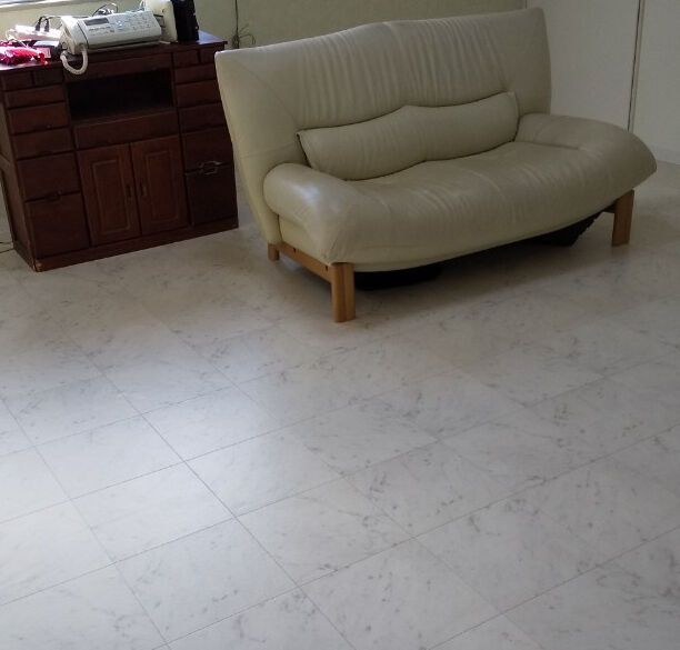 クッションフロアは洗面所やトイレといったお水を扱う場所に使用されることが多いですが、リビングにもご使用頂けます。(弊社リフォーム施行事例)