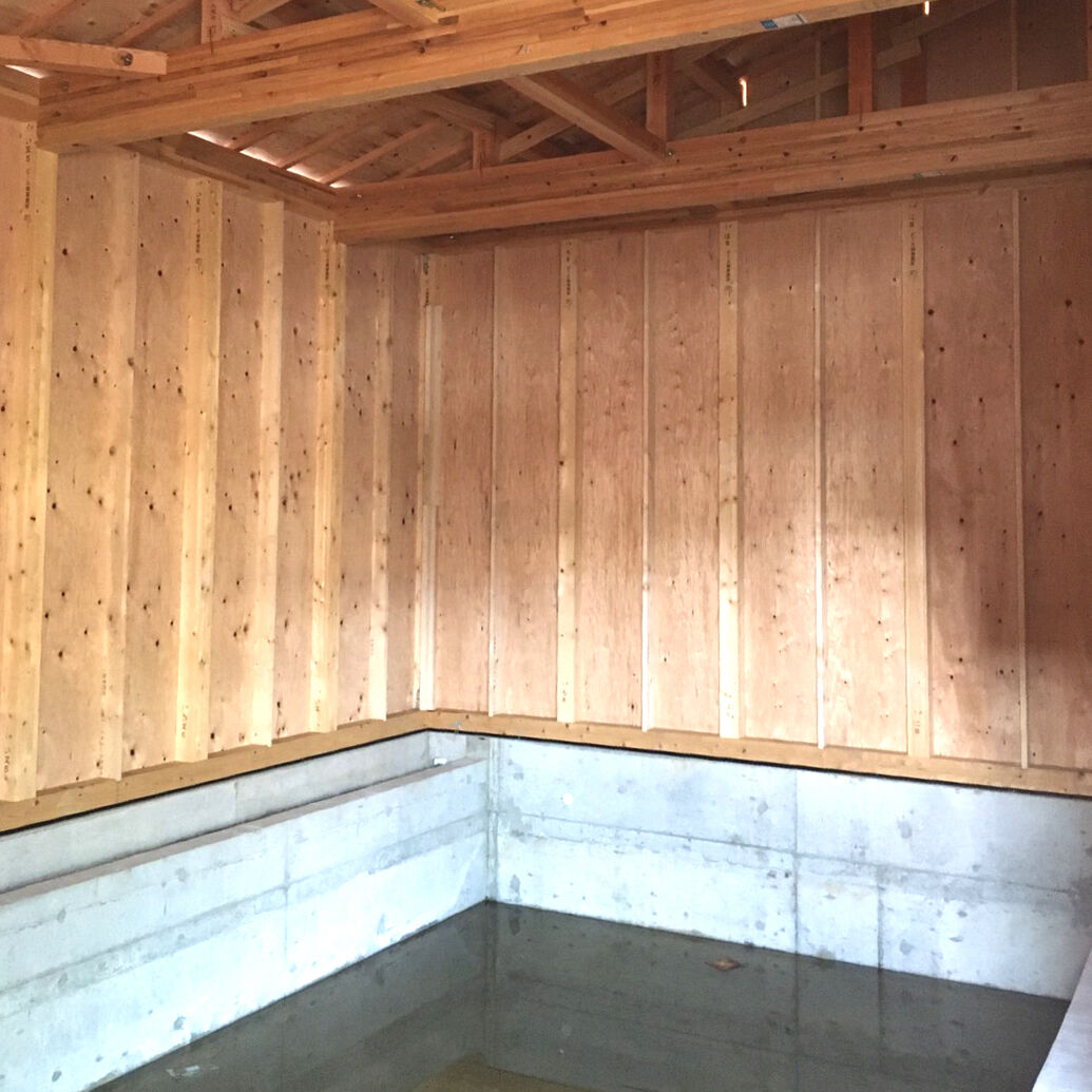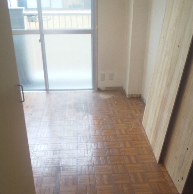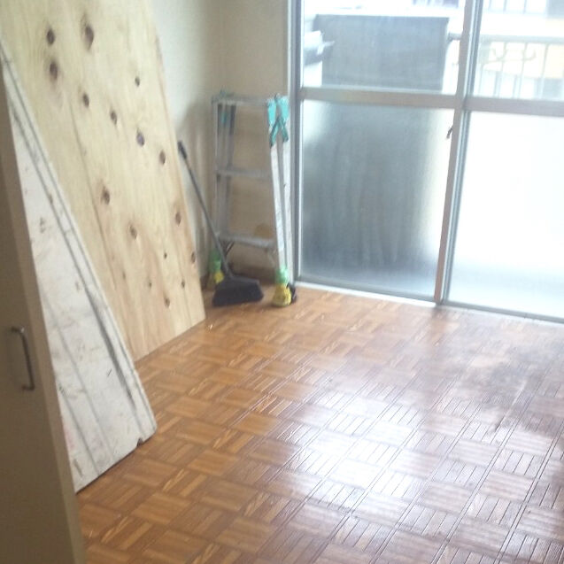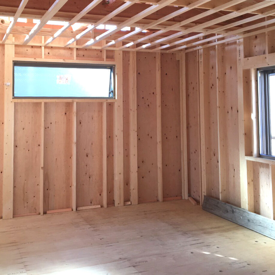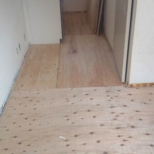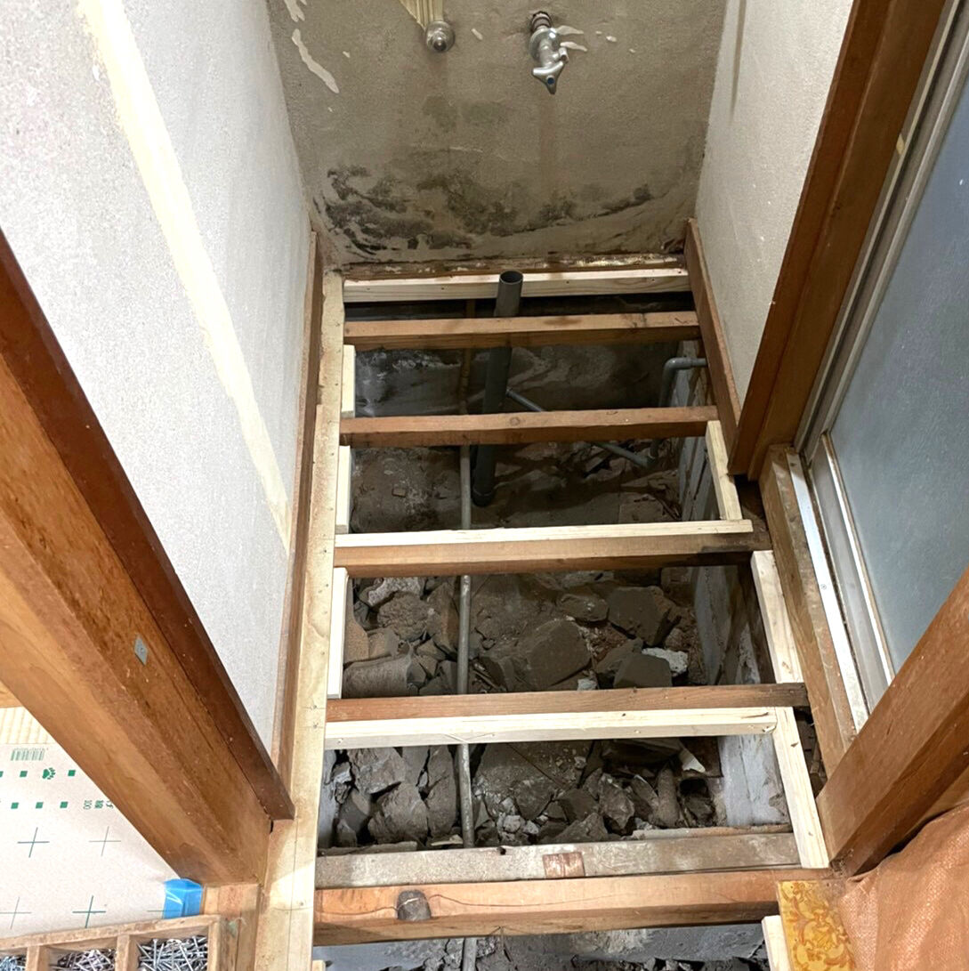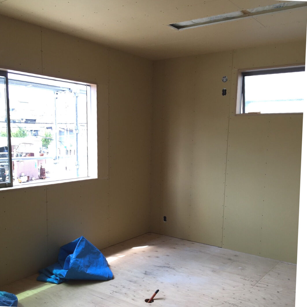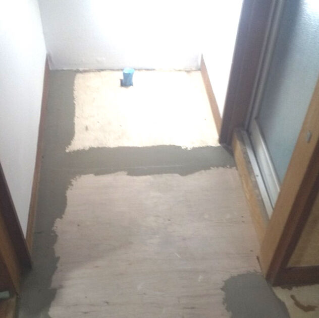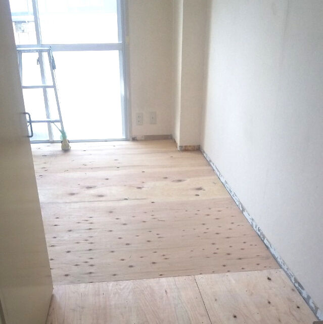 ビフォー画像がありませんので、工事の途中からお伝えします。床を取り除き、張り替えです。合板を張りました。壁にも新しく合板を張ります。 床はクッションフロア、防水加工や抗菌などの高機能性。