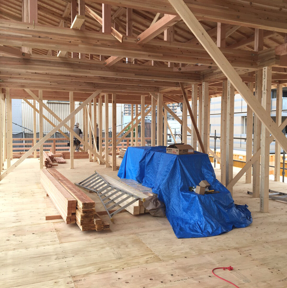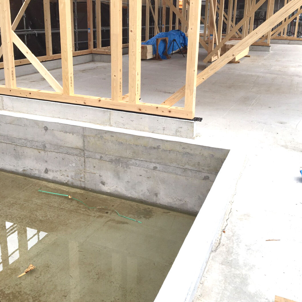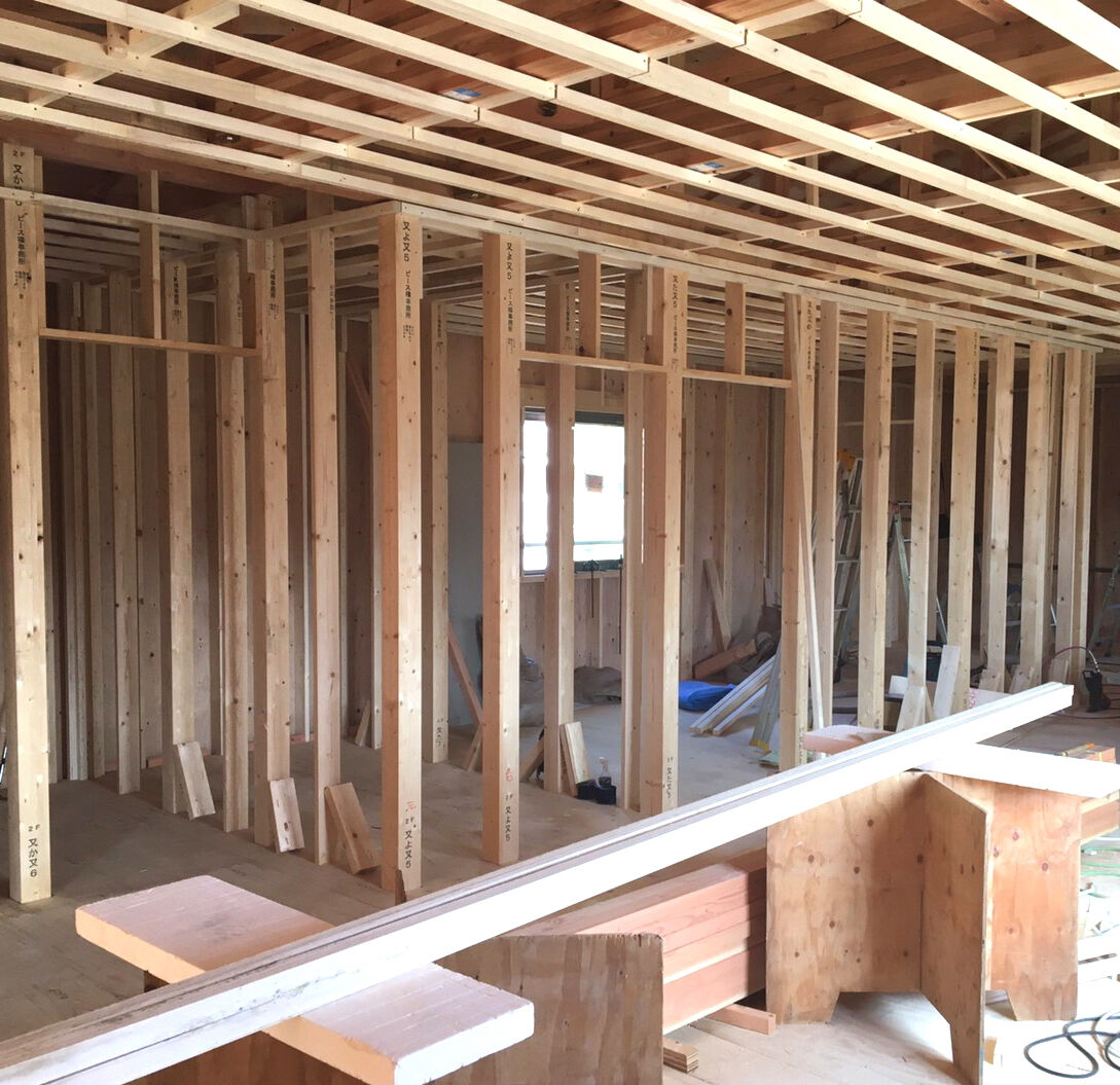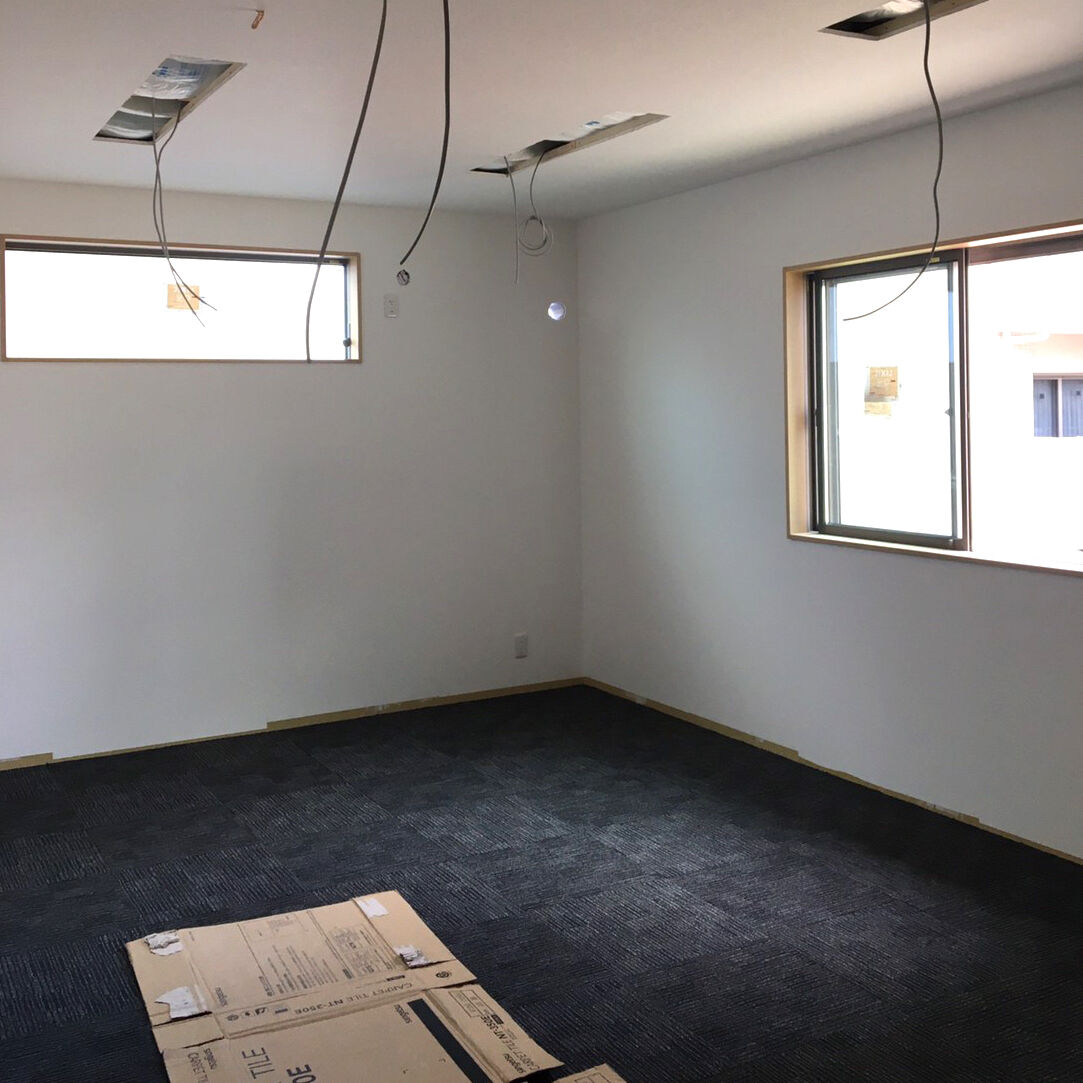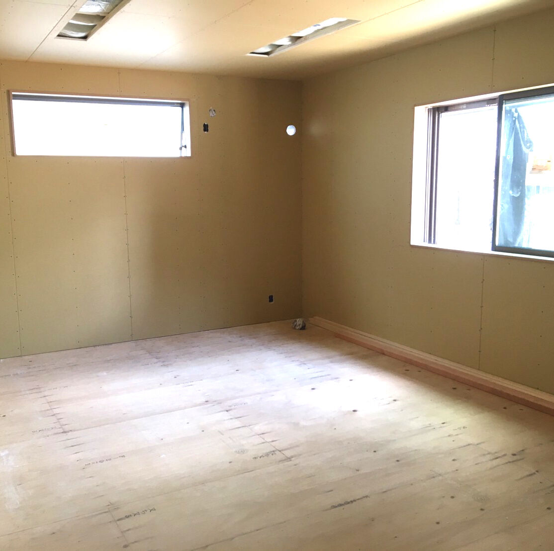 ビフォー画像がありませんので、工事の途中からお伝えします。床を取り除き、張り替えです。合板を張りました。壁にも新しく合板を張ります。 床はクッションフロア、防水加工や抗菌などの高機能性。