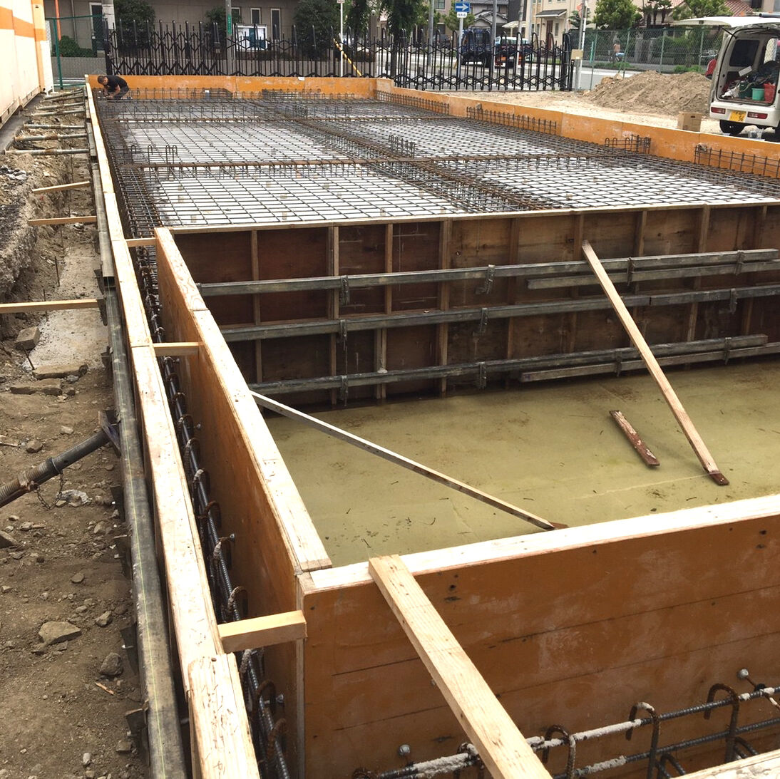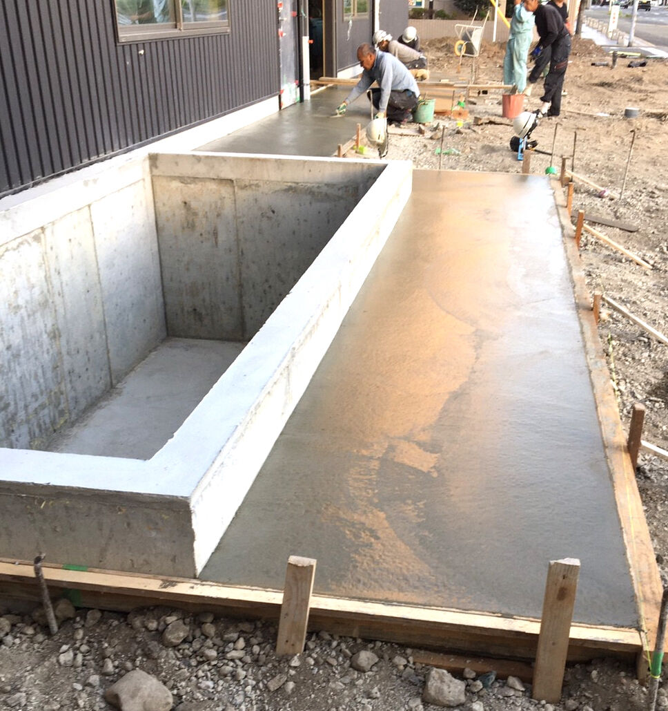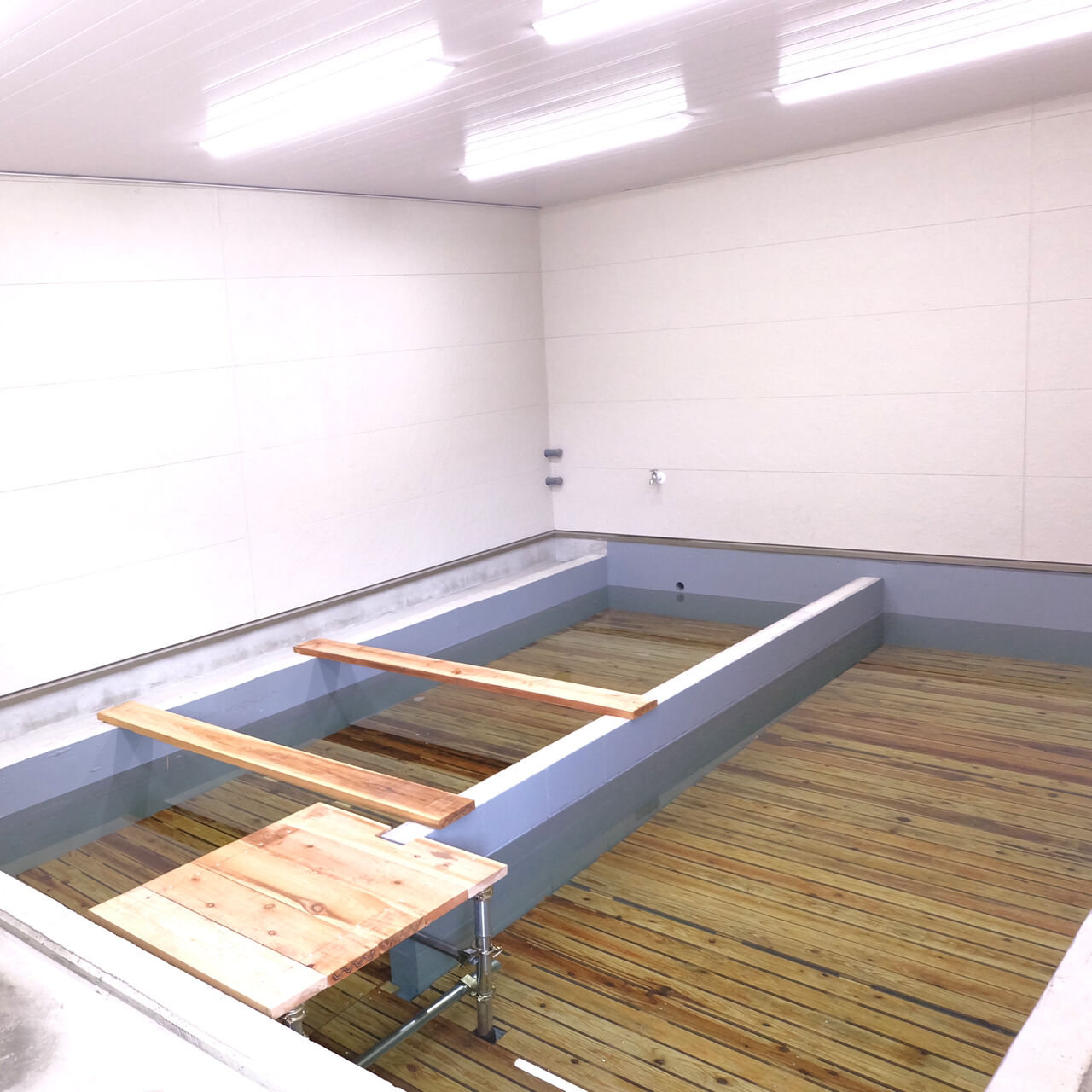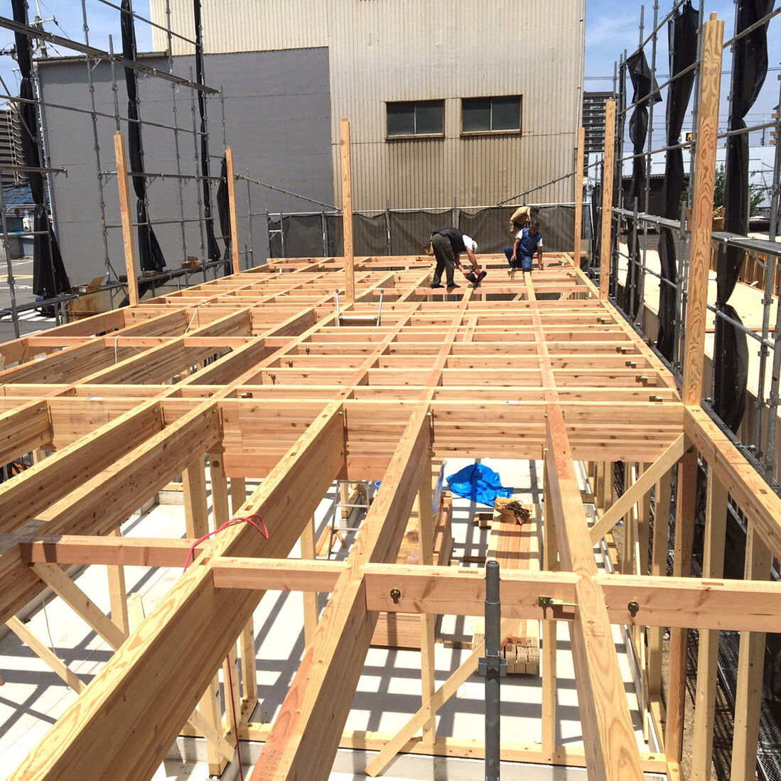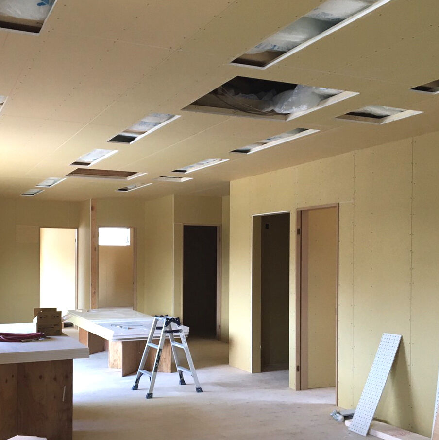 ビフォー画像がありませんので、工事の途中からお伝えします。床を取り除き、張り替えです。合板を張りました。壁にも新しく合板を張ります。 床はクッションフロア、防水加工や抗菌などの高機能性。