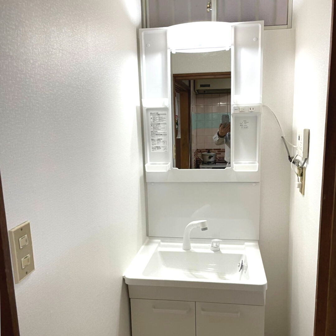 クロスはホワイト系で、暗かった洗面所が明るく清潔感のある空間に。右に少し隙間が出来ましたが、収納スペースとしてアイデアが湧きそうです。