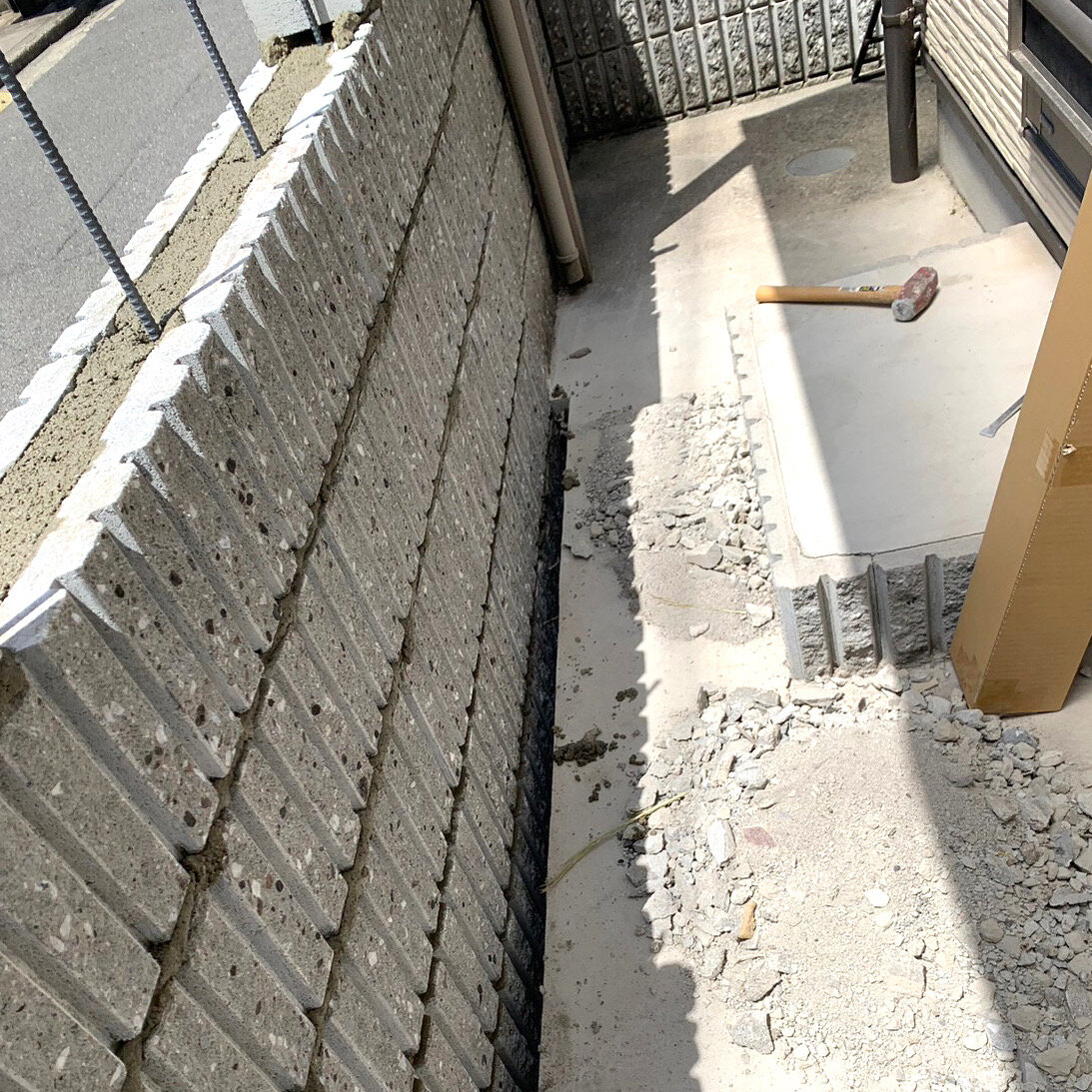 ブロック塀をある程度まで壊し撤去します。鉄筋を入れてブロック塀を再建していきます。