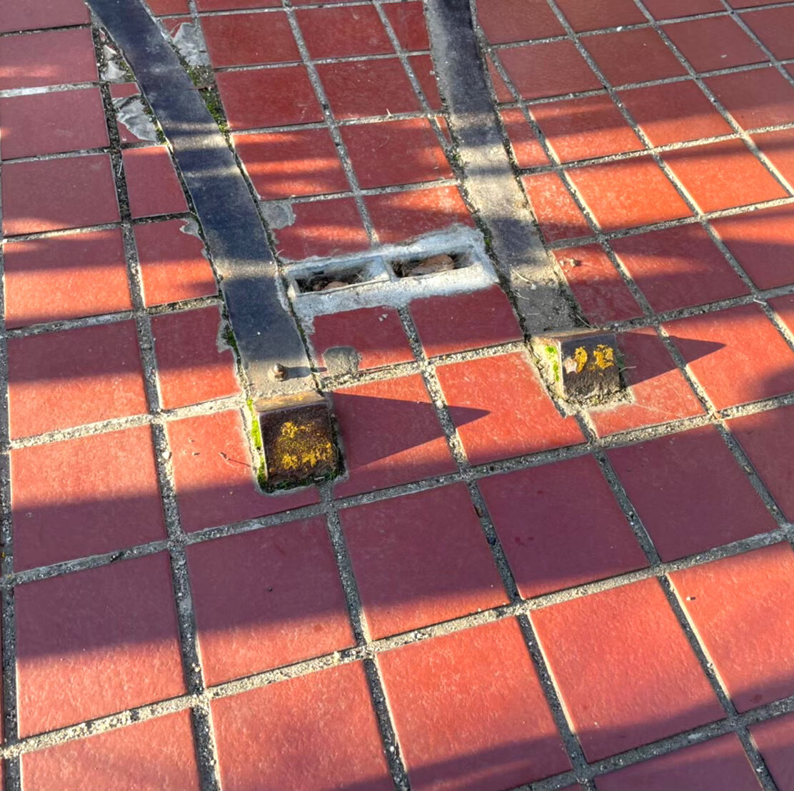 英彰ふれあいセンターの門扉のストッパー部分が三角に飛び出していて、