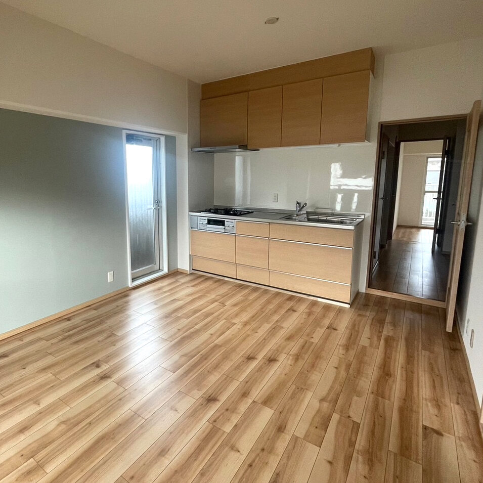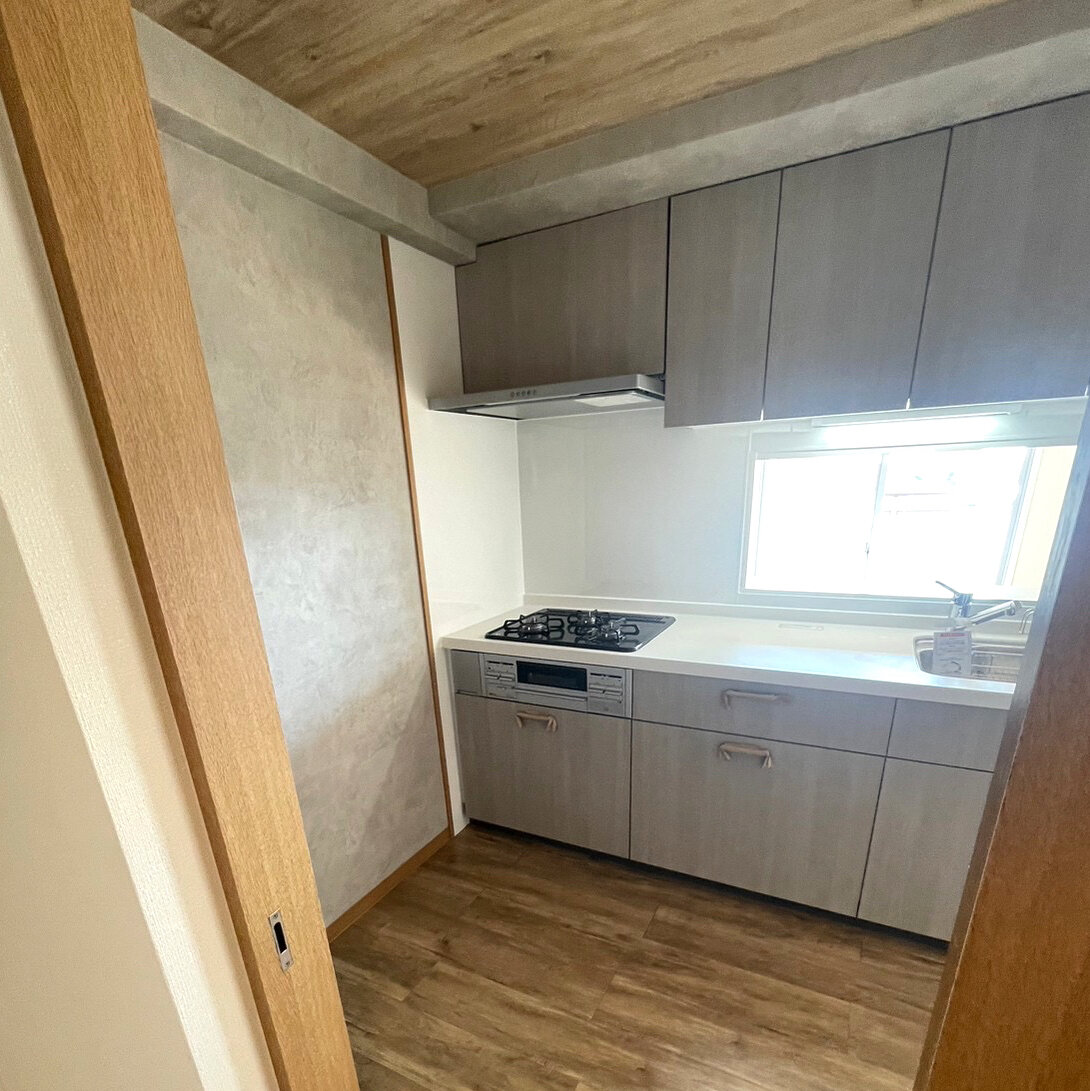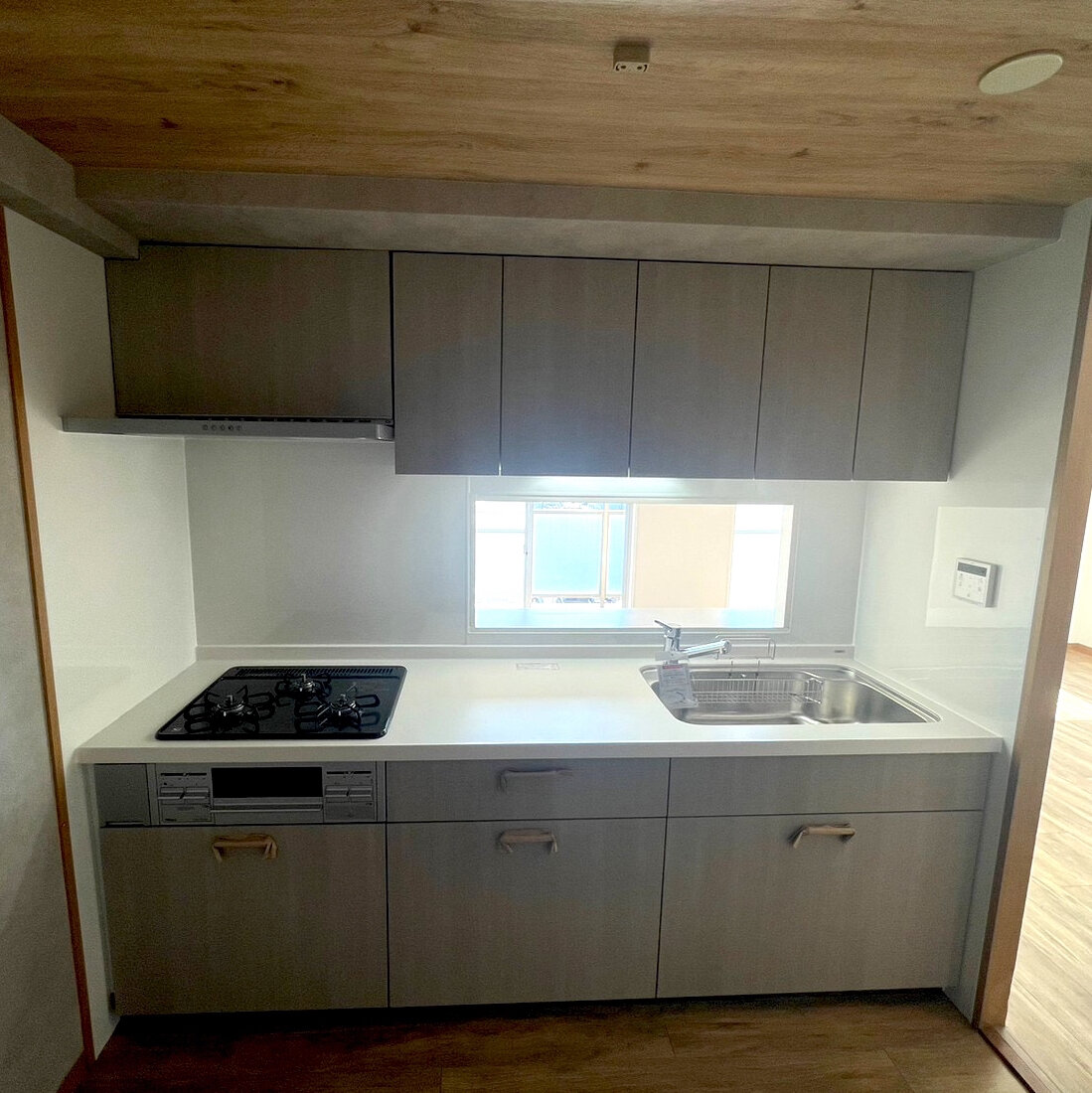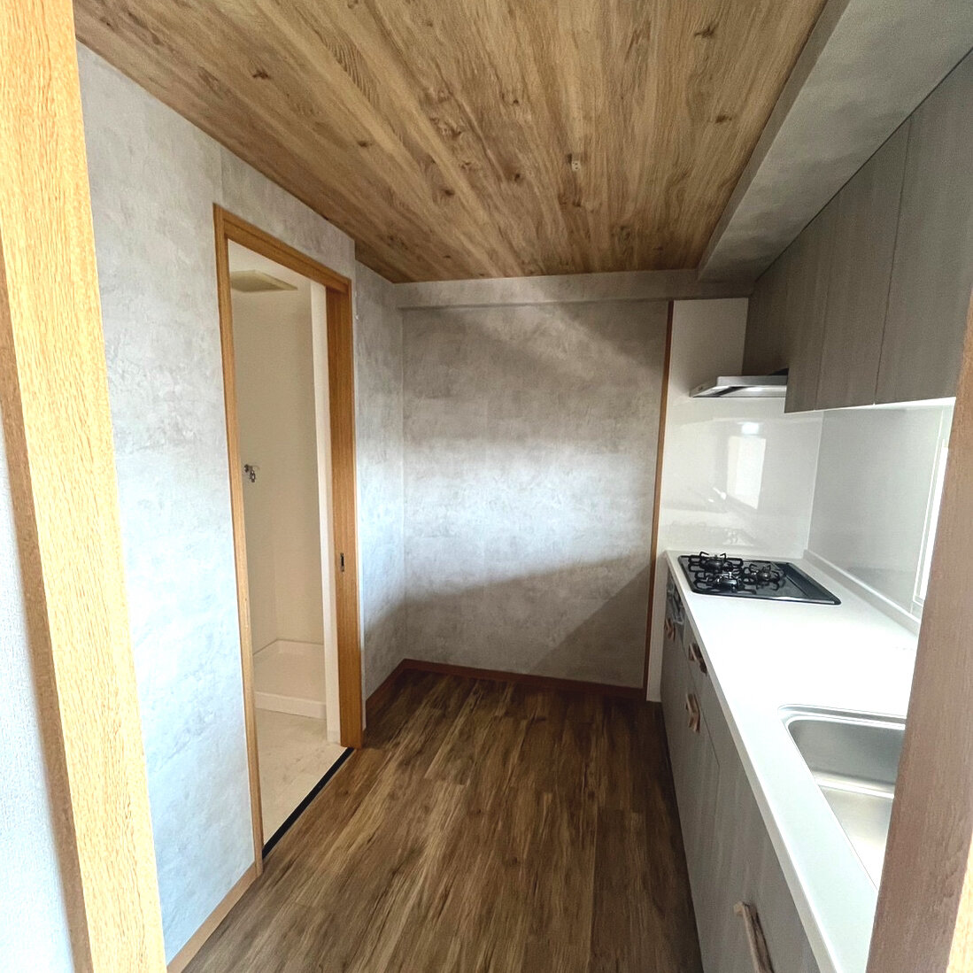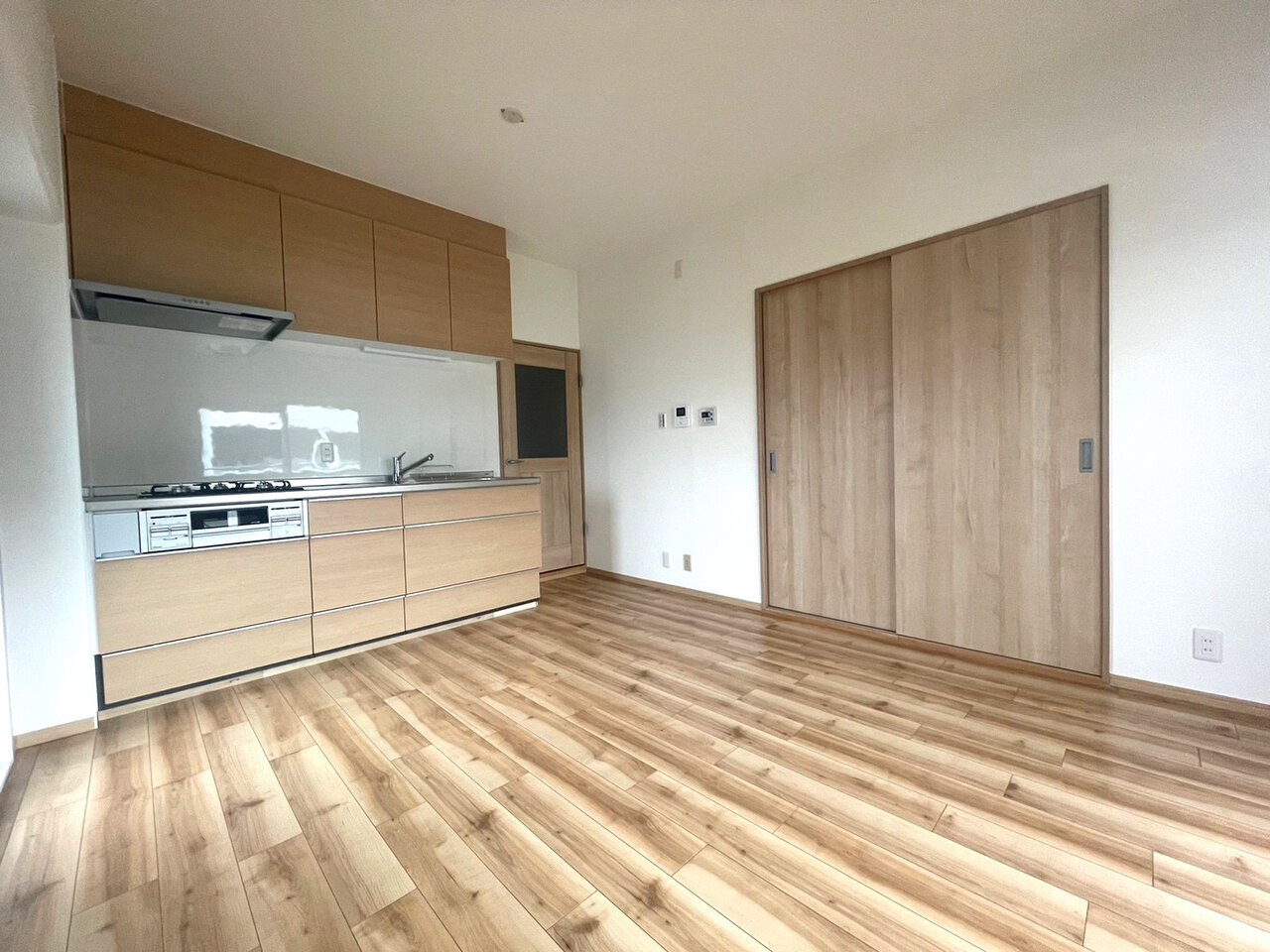 床材と天井のクロスが木目調、キッチンパネルはそれに合わすように淡いカラー。