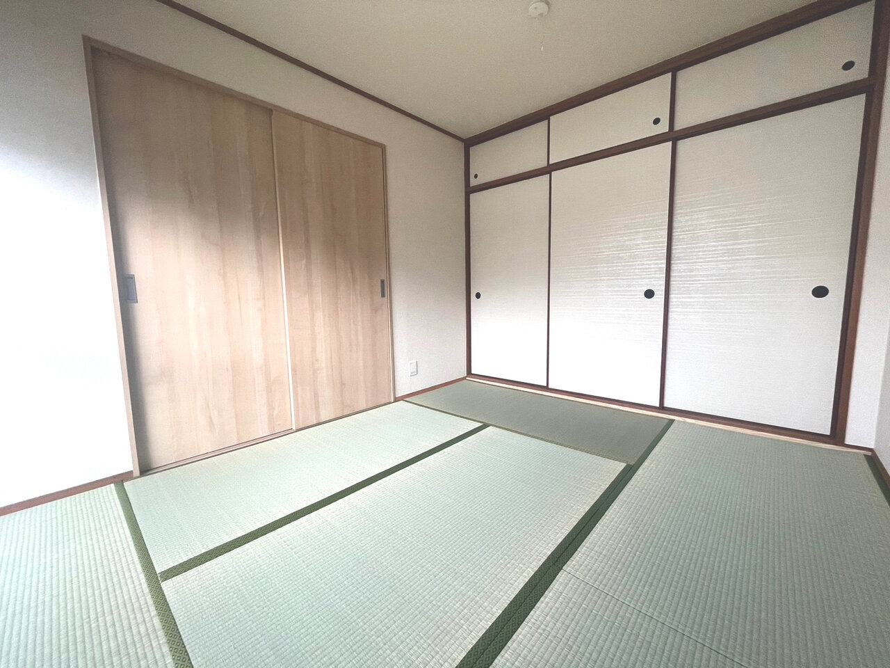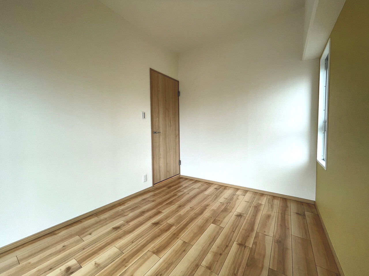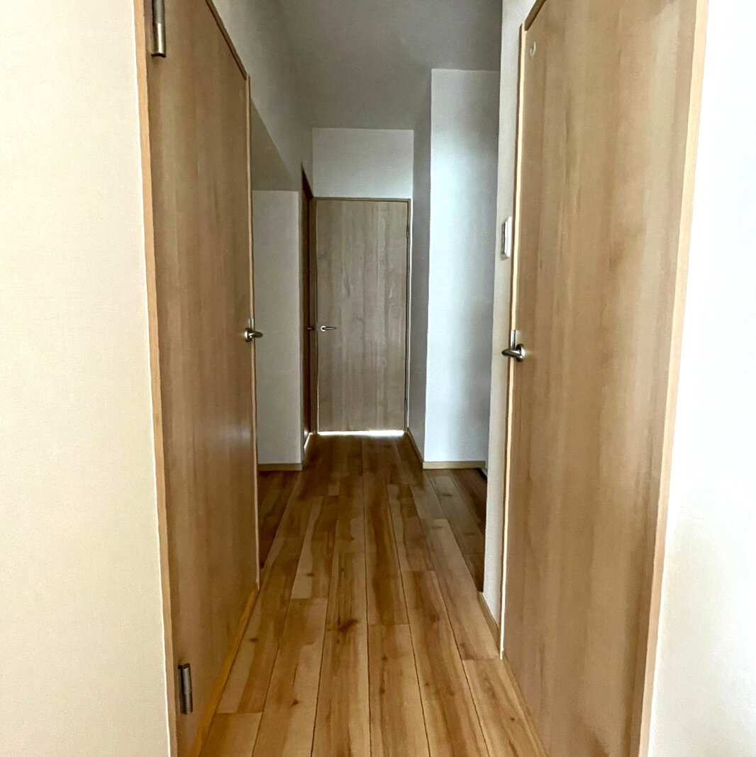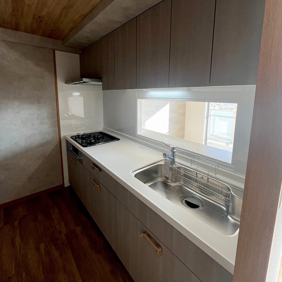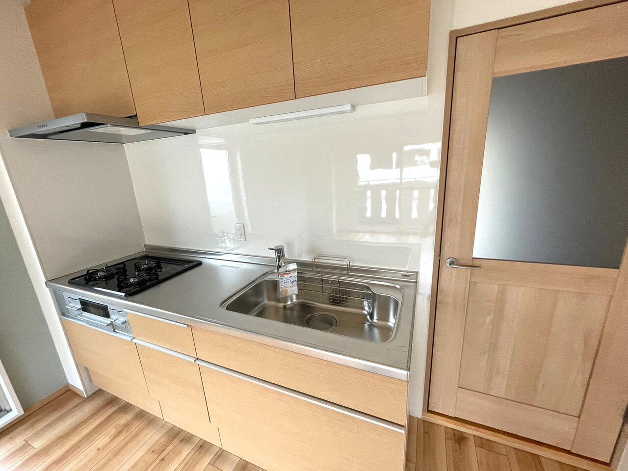 床材と天井のクロスが木目調、キッチンパネルはそれに合わすように淡いカラー。