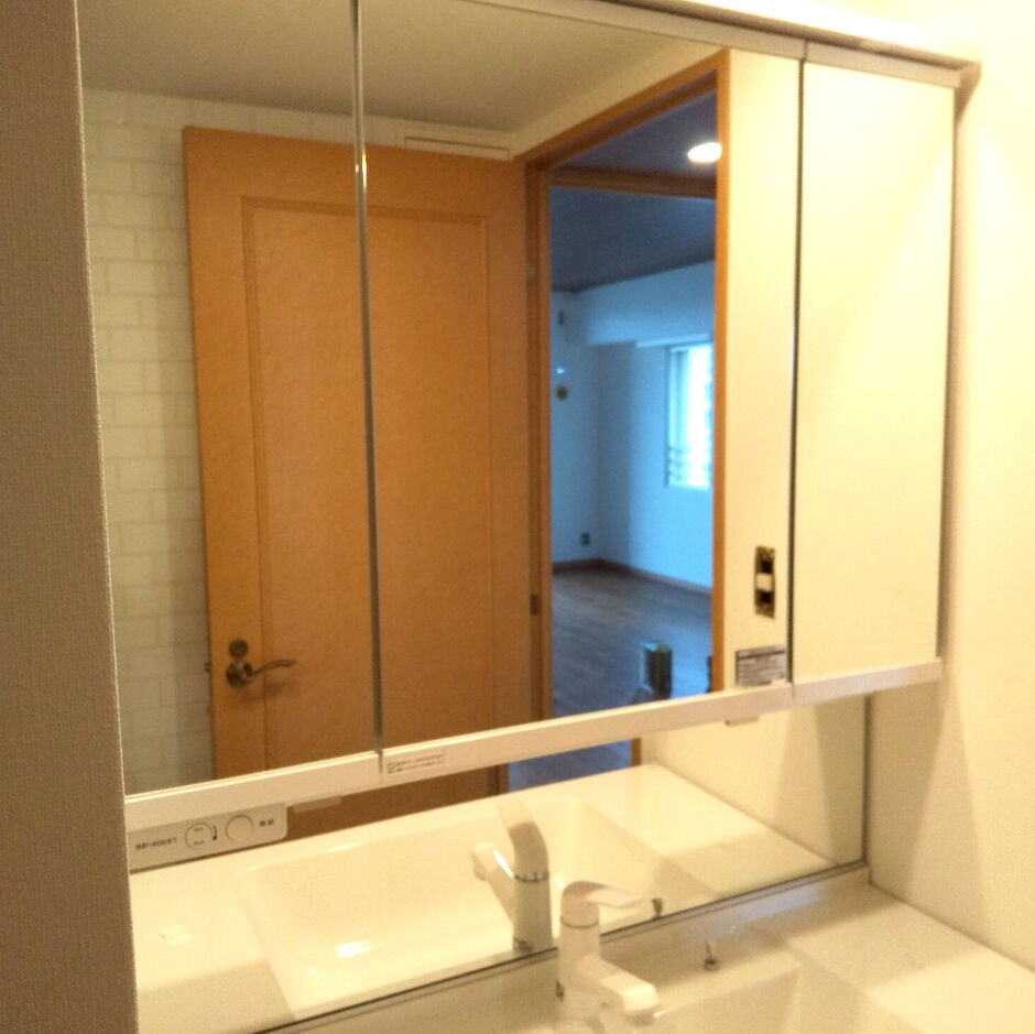鏡面裏収納は細々したものがたくさん入り便利です。洗面ボールは大きく使い勝手よいものに。