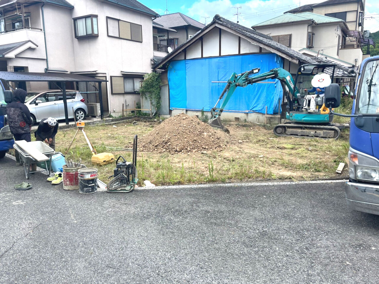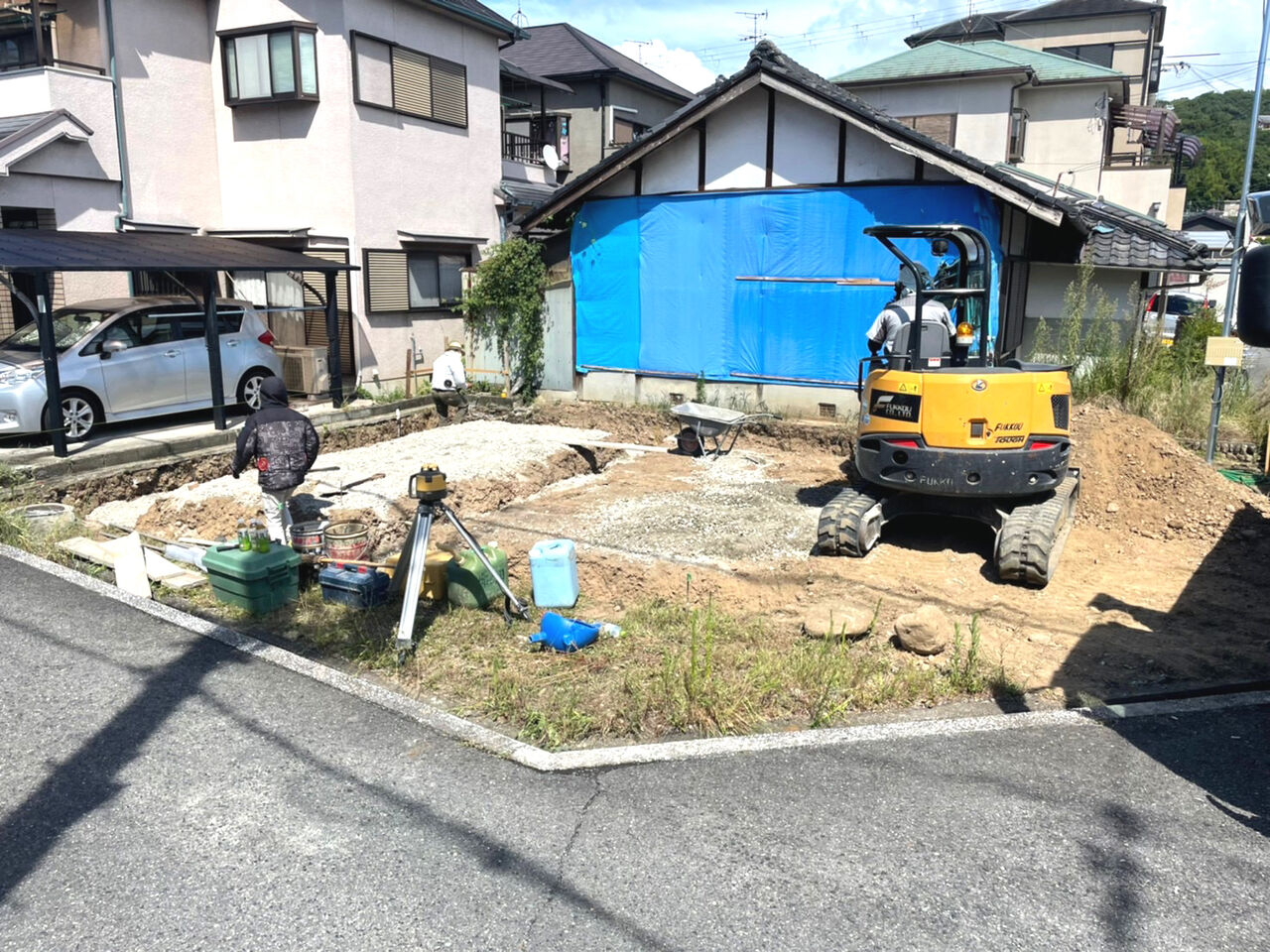 ショベルカーで土を運び入れます。基礎工事が始まります。基礎形状に合わせて地面を掘り、砕石を敷きます。