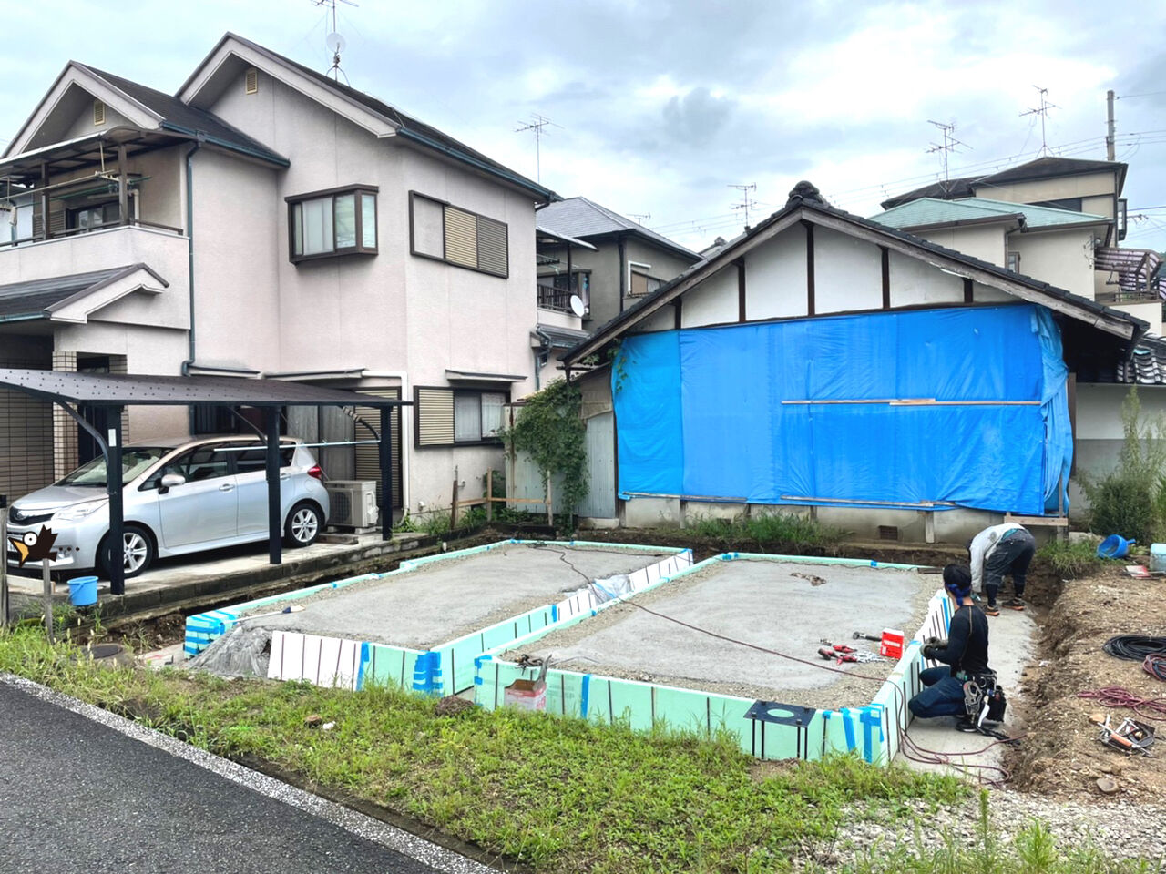 草の生い茂っていた空き地が整地され、基礎工事が始まり、これから建物が建ちます。
