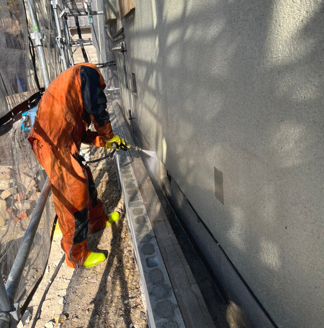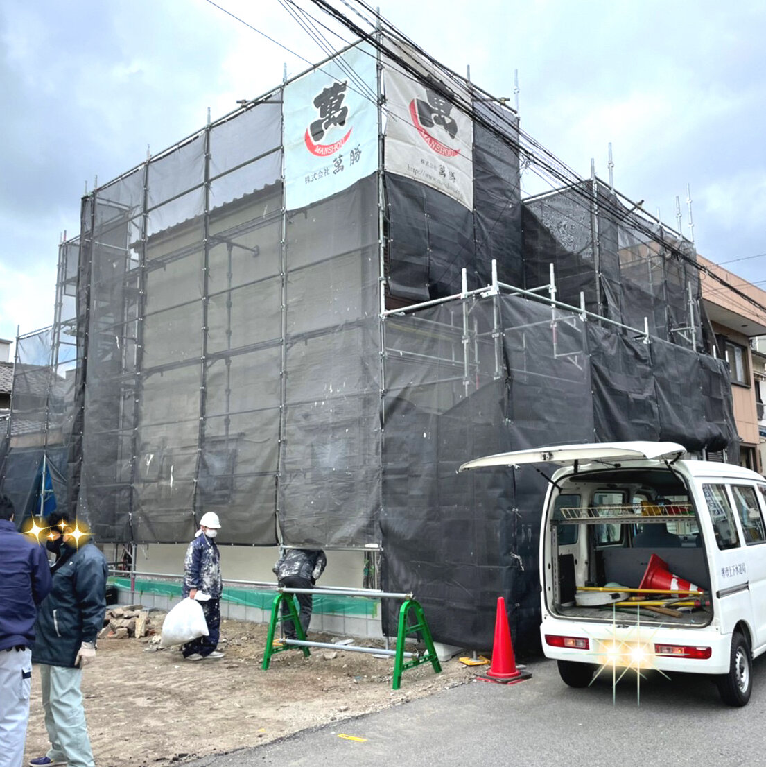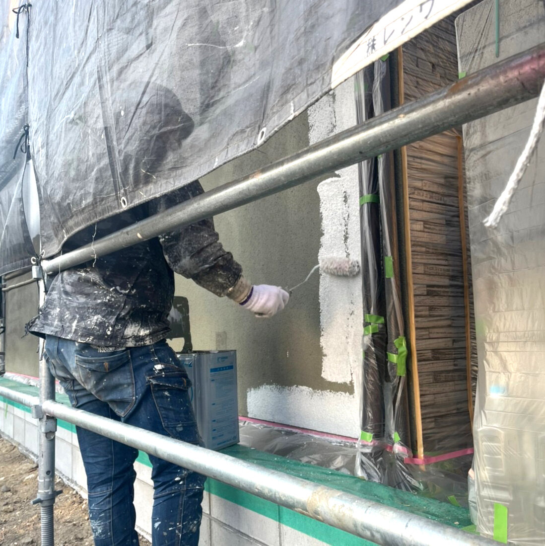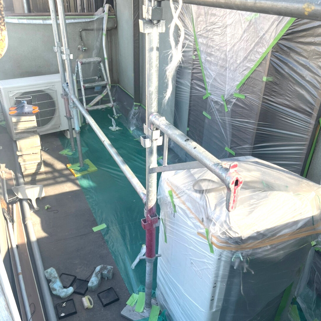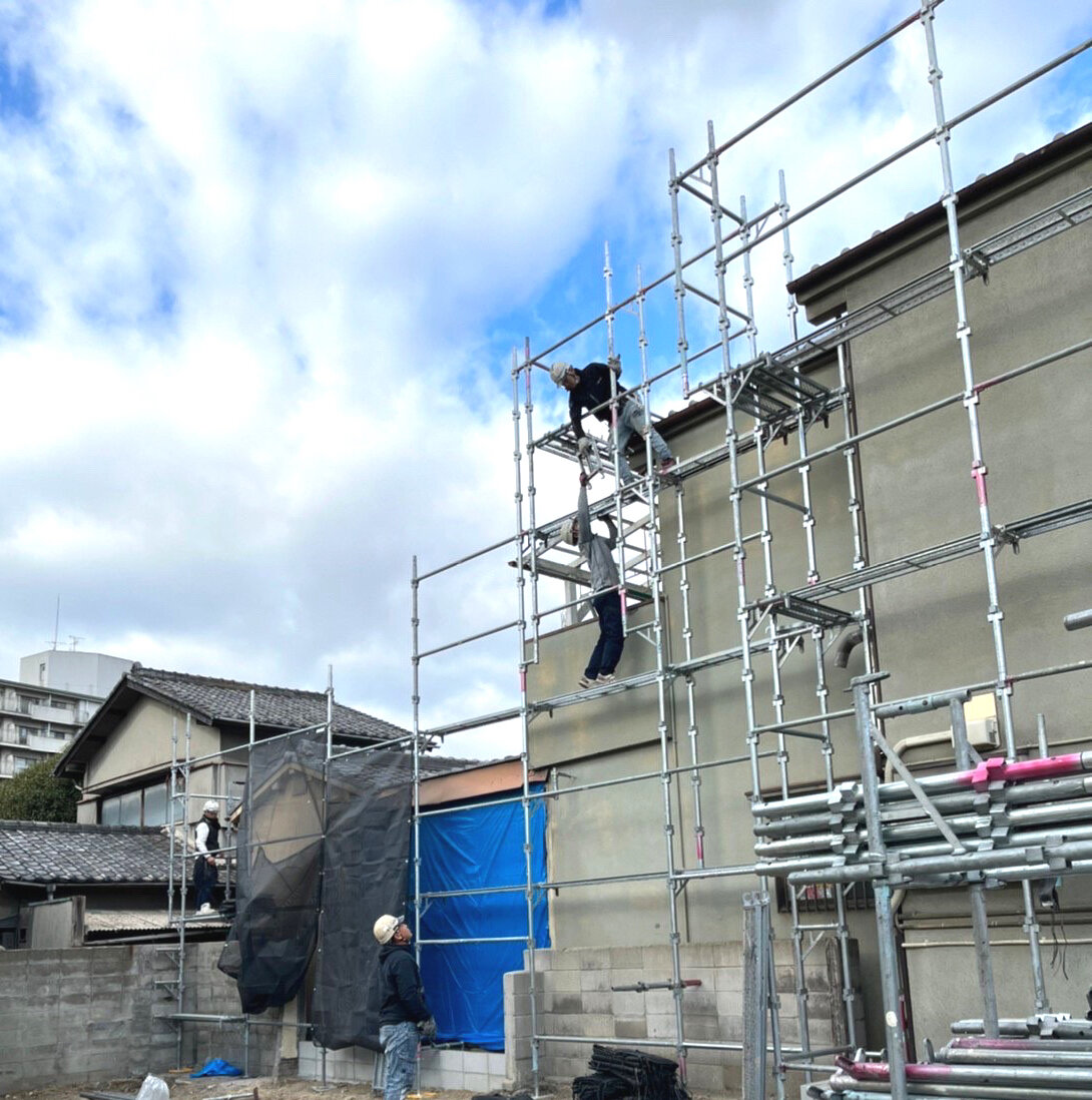 足場を組みます。足場幕を取り付けます高圧洗浄します。塗装の前に汚れてはならない箇所を保護します。塗装します。職人さんの丁寧なお仕事です。足場を解いていきます。終了です。