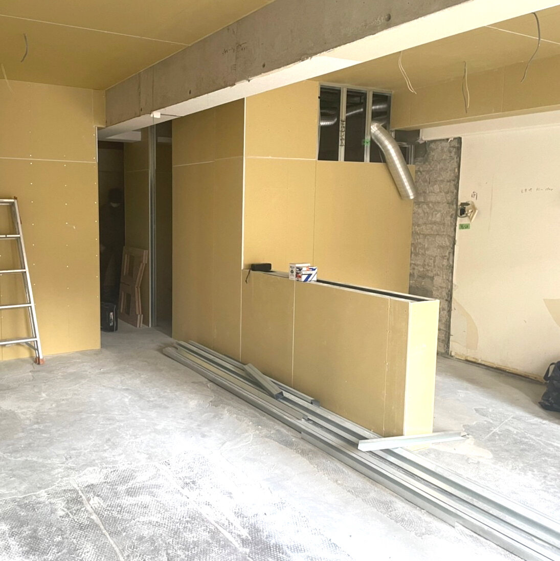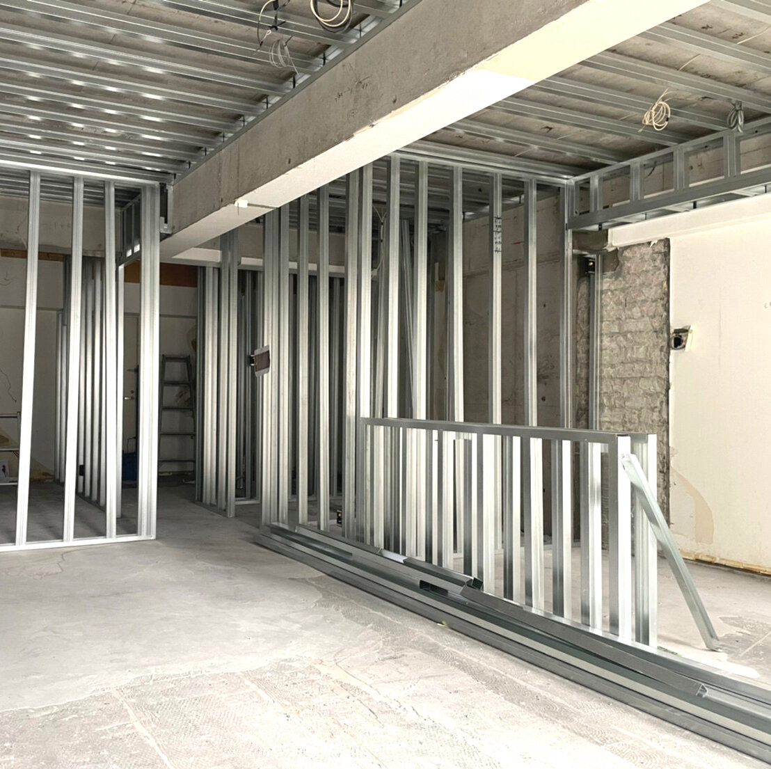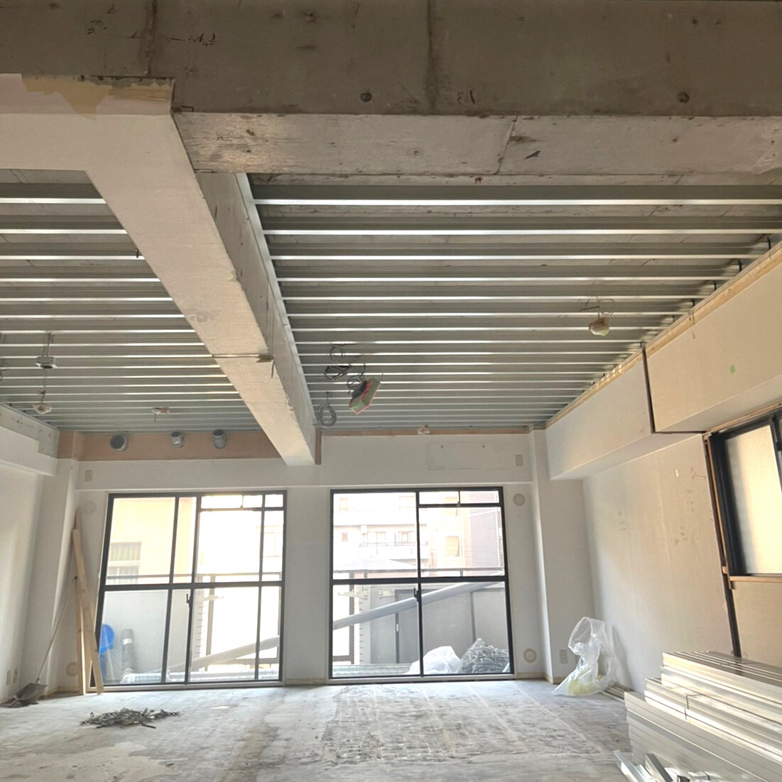 リノベーション工事が始まり、全てを取り除いたワンフロアになった所までご紹介していました。部屋を作るために間仕切り壁を作っていくのですが、それにLGSという軽量鉄骨を主に使用しています。